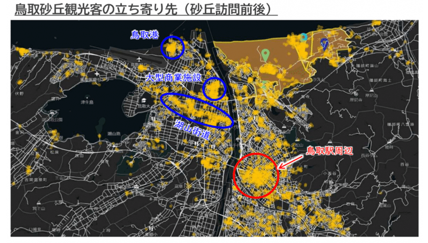 例えば、鳥取砂丘を訪問する観光客の鳥取砂丘訪問前後の立ち寄り先を可視化しました。下の図の通り、鳥取砂丘から約6km離れた鳥取駅周辺に、県による施策検討時の想定以上の人数が滞留していることが確認されました。