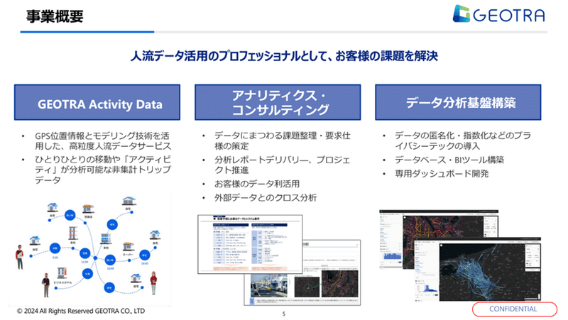 事業の内容として、独自の個人情報保護技術により、人々の動きや行動目的などが高粒度に可視化された人流データ、GEOTRA Activity Data(GAD)を提供しています。