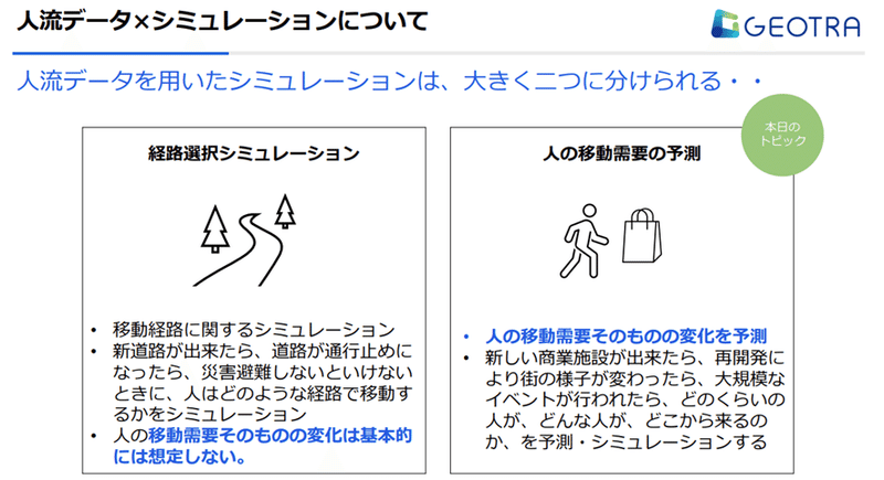 こうした人流データを用いたシミュレーションを行う際、大きく2つのシミュレーションが考えられます。