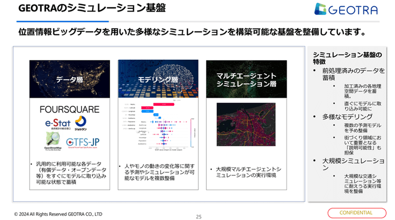 また、GEOTRAでは、人流データや決済データ等の位置情報ビッグデータと、機械学習モデルを掛け合わせることで、シミュレーション・予測モデルを構築しています。