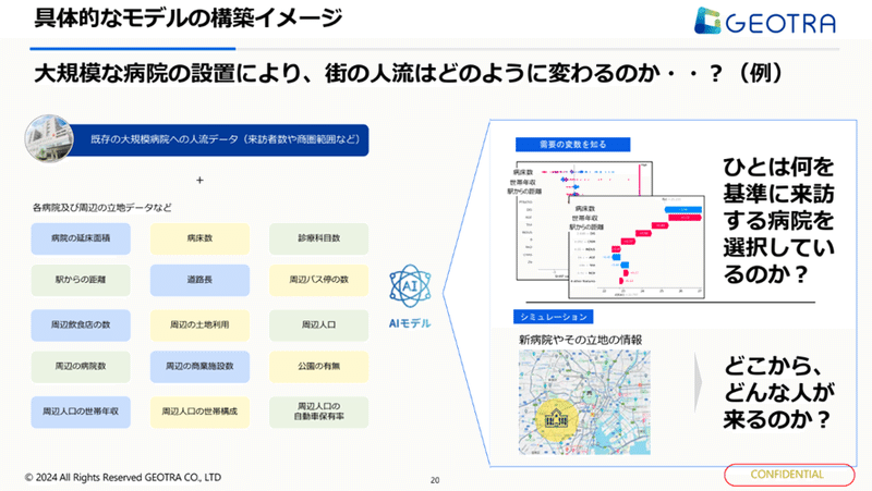 これらの正解データと特徴的なデータを機械学習で掛け合わせることで、人は何を基準にどの病院に行くか、どれくらいの延床面積・診療科目数にすると、どの程度の需要が見込めそうか、といったことをシミュレーションし、事前に把握することができます。