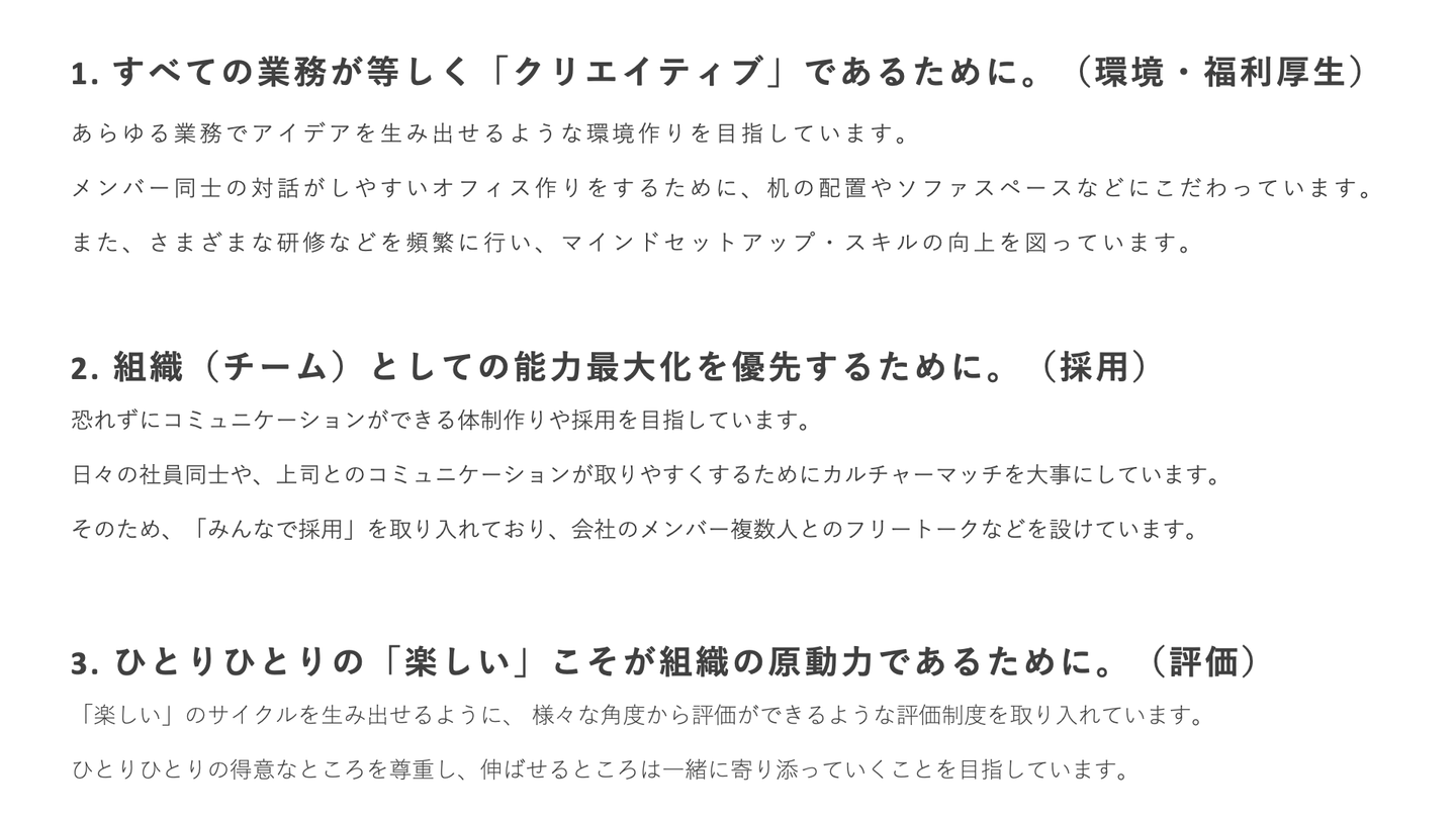上記に挙げているミッションを元に考えると、チームメンバーそれぞれの個性や能力が最大化され、協力し合えることだと私たちは考えます。お互いの能力をリスペクトし合える組織なら、協力し合うことができ、いい関係性を築くことができそうですよね。