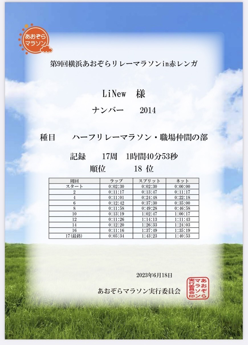 フルマラソンやハーフマラソンは自分との戦いですがリレーマラソンは襷を待っているメンバーているという心の支えがあるので、やる気が湧き楽しく走ることができました✨