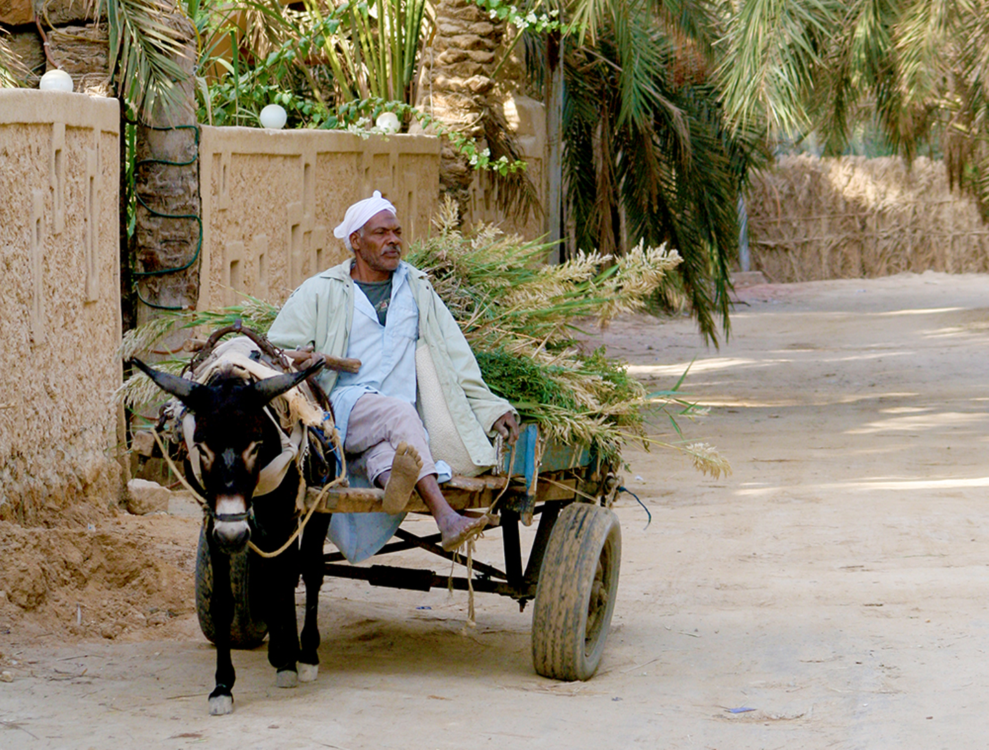 朝陽と共にロバに引かれてデーツの森へ入ってゆき、日が暮れる頃になると山と積まれたデーツとともにひきあげてくる。