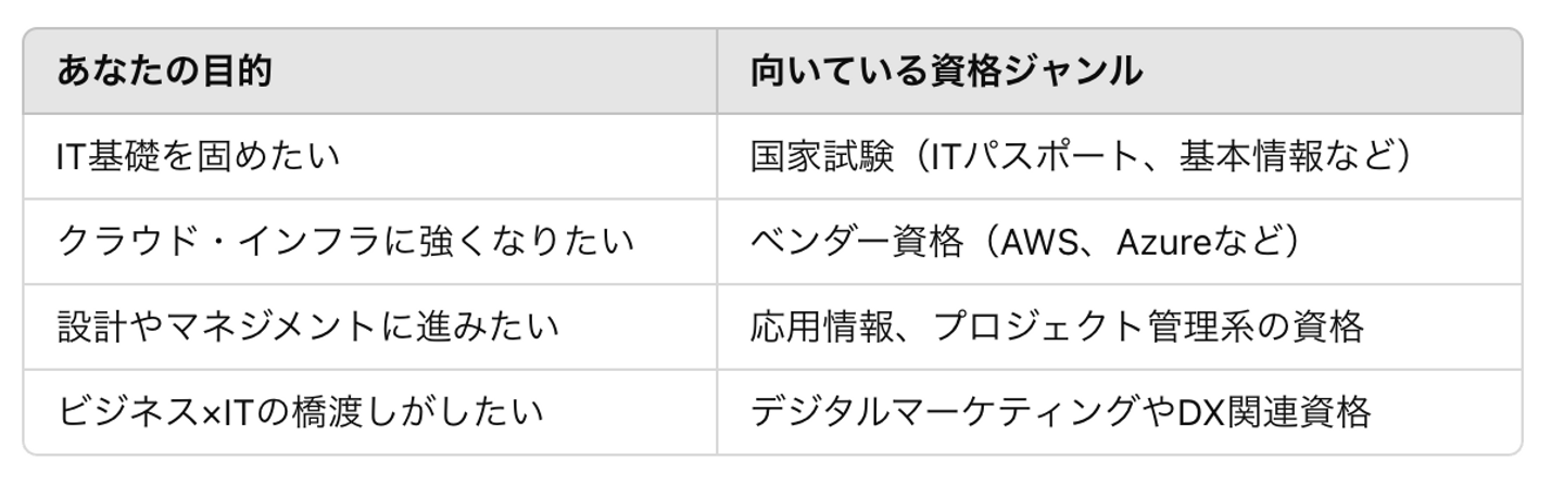 取得資格の方向性資格選びは、知名度や流行に流されるのではなく、「自分がどのようなキャリアを描きたいのか」を軸に考えることが重要です👩💻