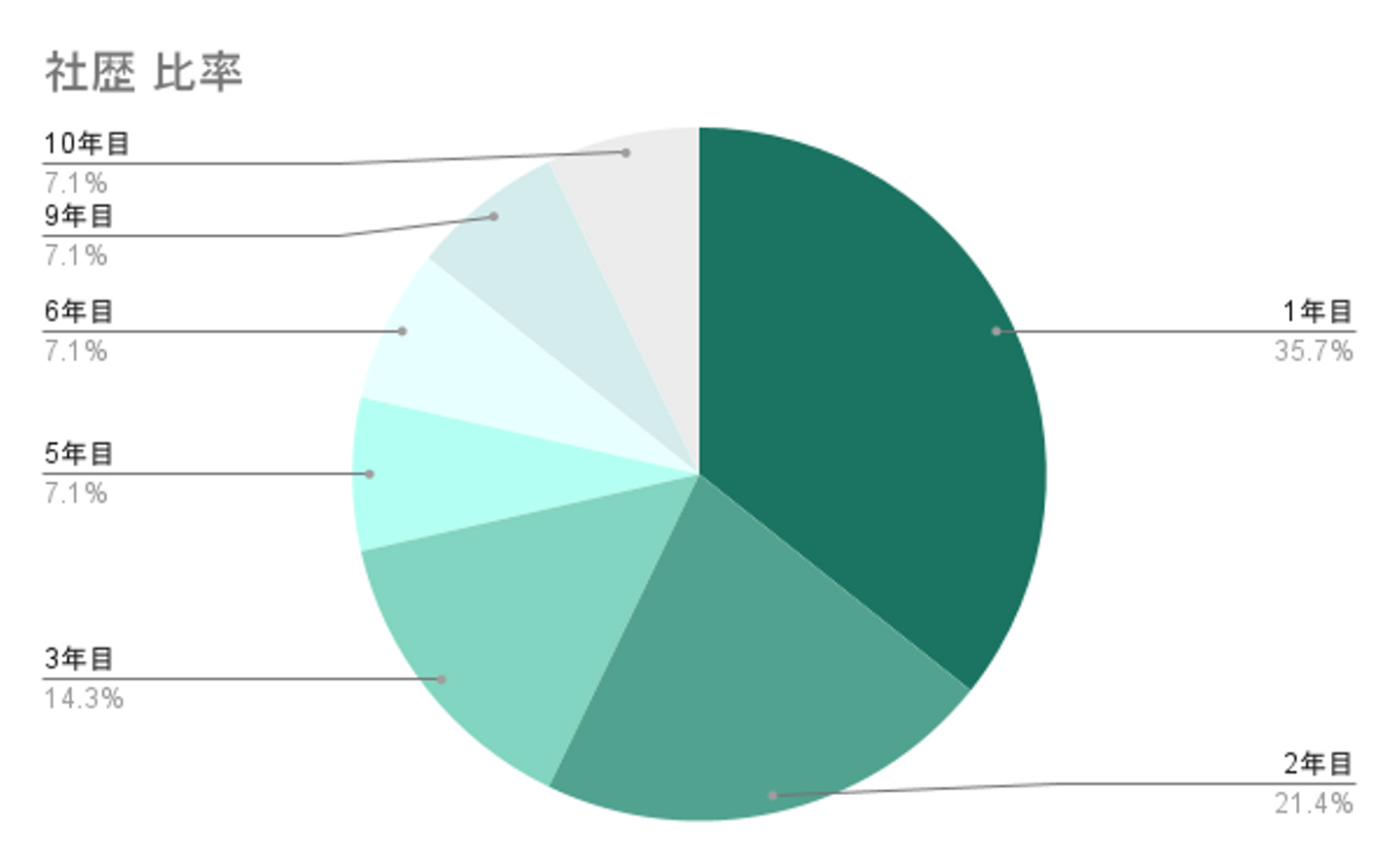 社歴構成比としては1年目が5名で最多となっておりますが、これは7期目くらいから事業規模が大きくなるにしたがって中途採用を増やしているためです。