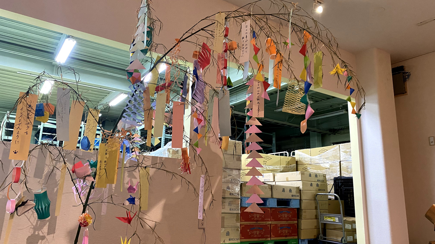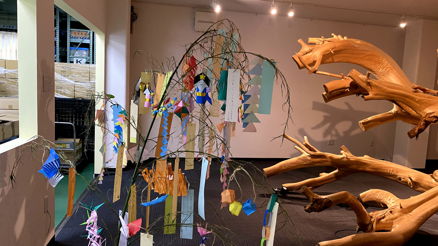 本日は7月7日。七夕ですね。という事で、笹の葉がさらさら 1Fのギャラリー「Switch」に揺れています。みんなでワイワイ言いながら、短冊に願い事を書いたり、折り紙で飾りを作ったり。