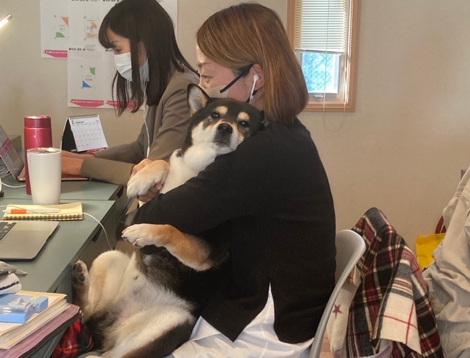 ※社員に抱っこされてオンライン会議に参加。つまらない、という表情