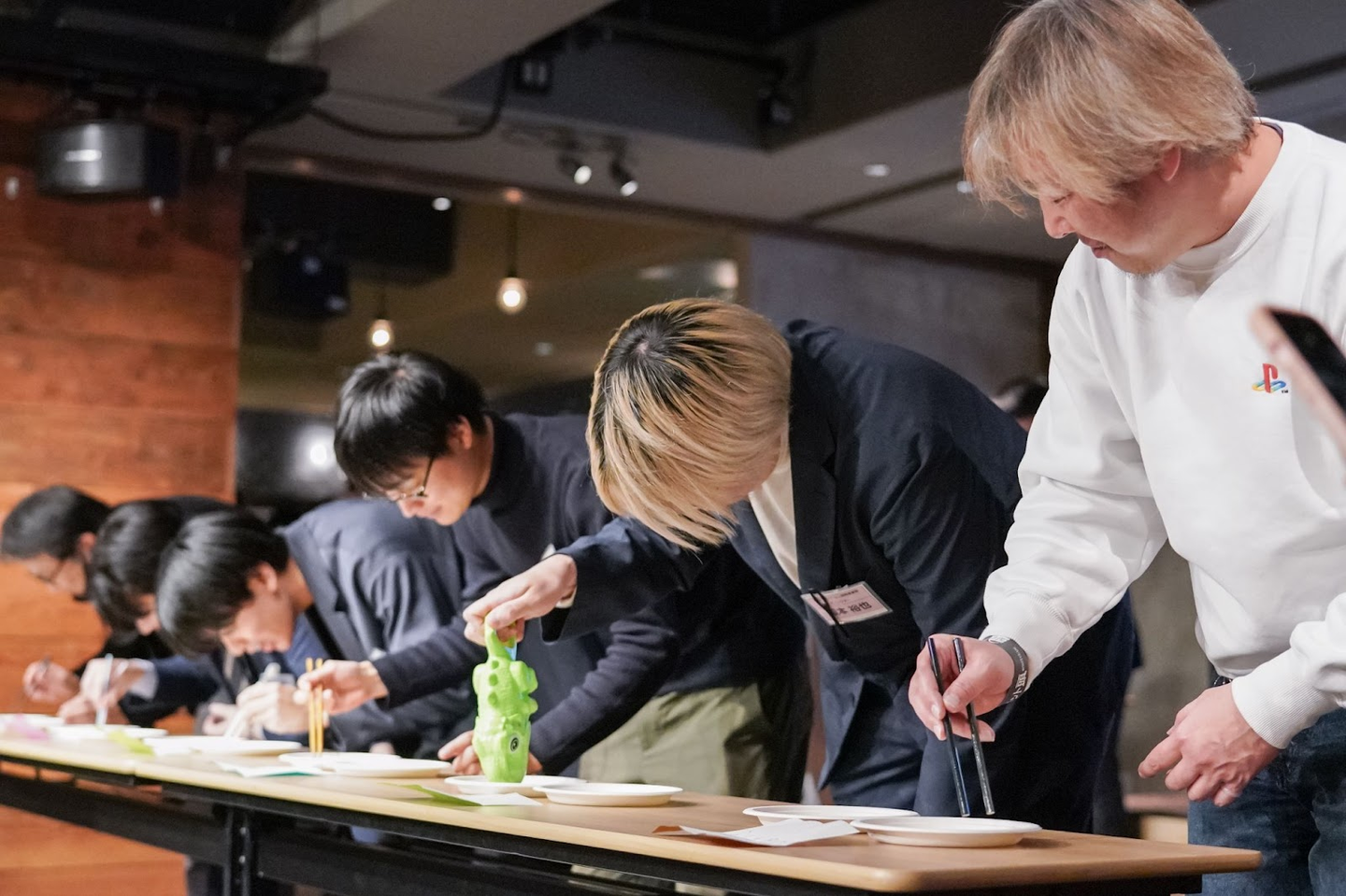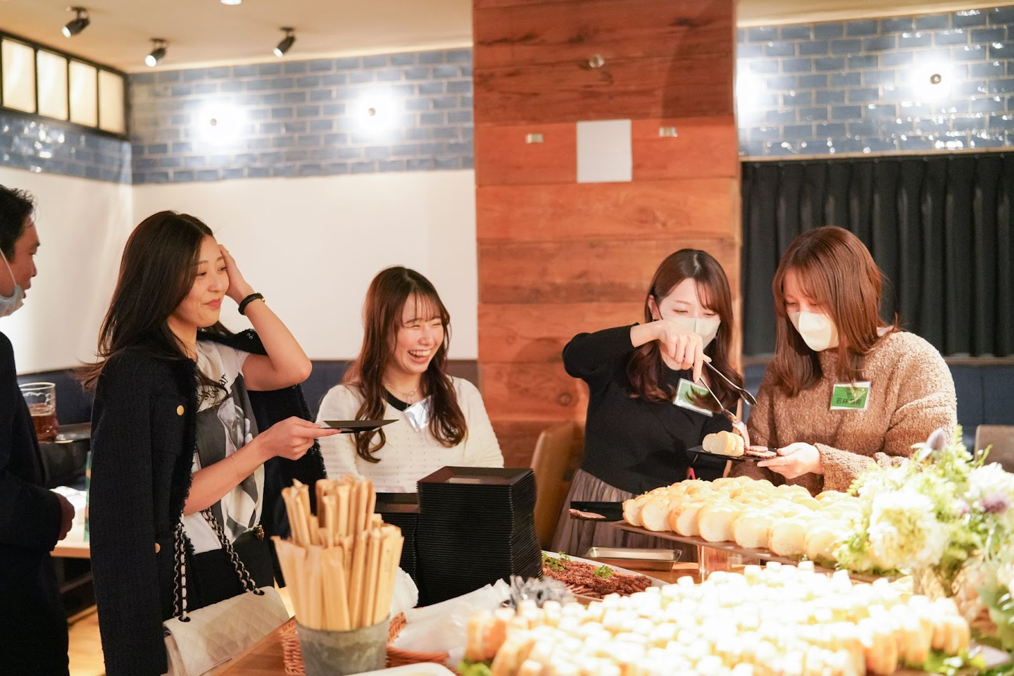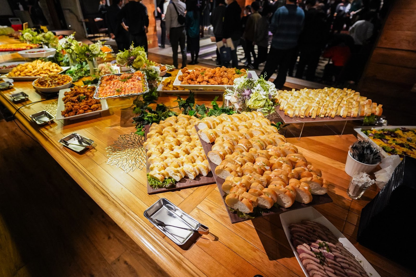 会場には食べ物やドリンクも準備され、社員たちも開始時間に合わせて徐々に揃っていきます✨