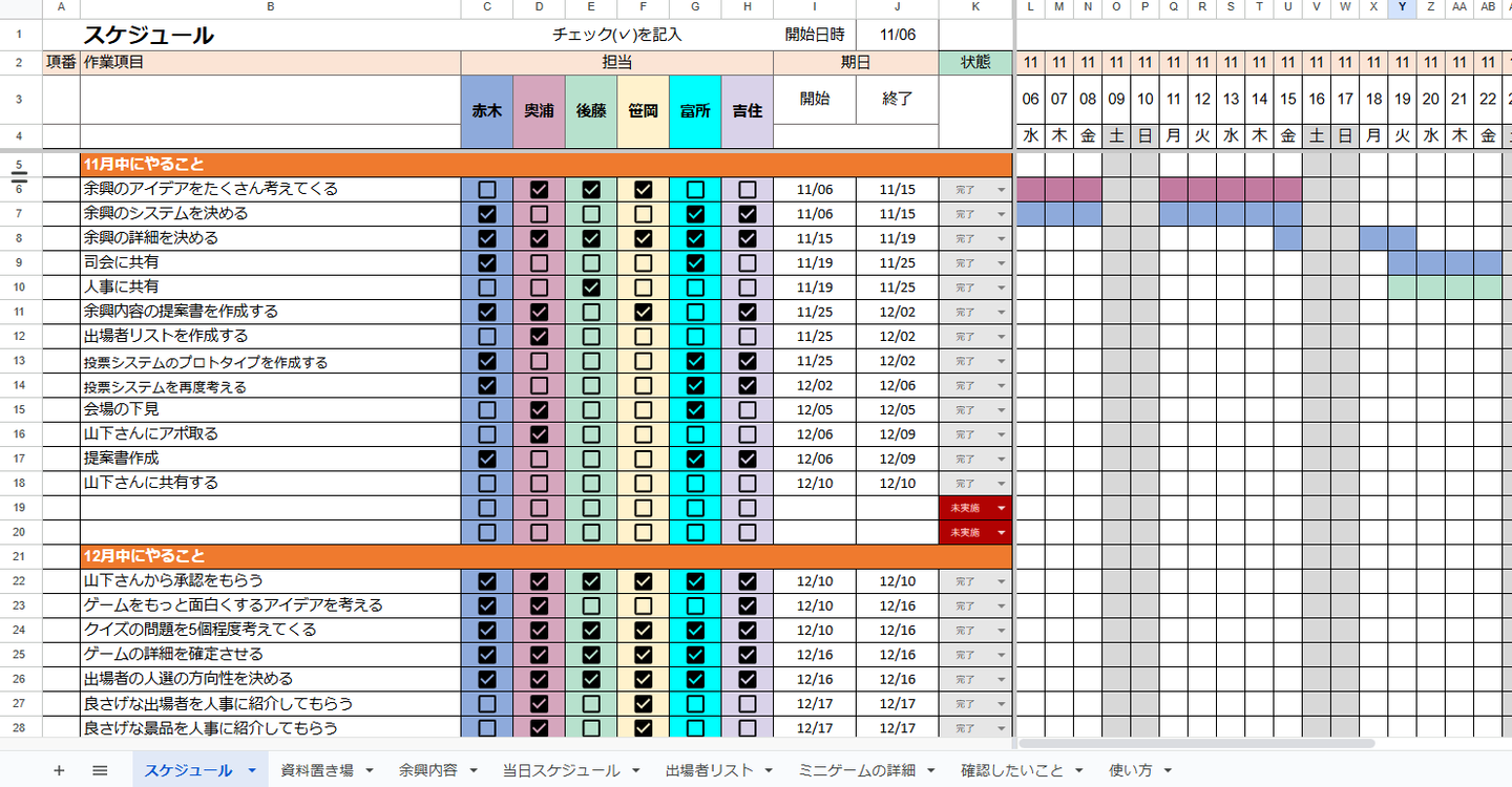 👇余興の準備には、案件のプロジェクトで使用するような『進捗管理シート』も用意されており、驚きました。しっかりしているな……と。