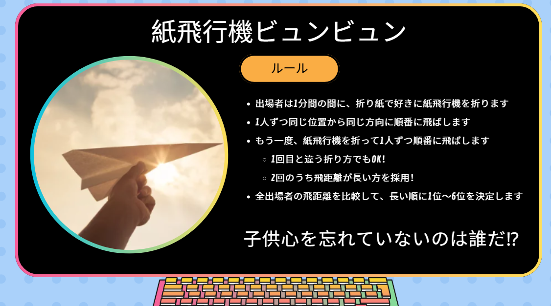 画面の前の皆さまは紙飛行機の作り方ってまだ覚えてますか? 私は会場下見の際に作ってみましたが、ほぼ覚えてませんでした。