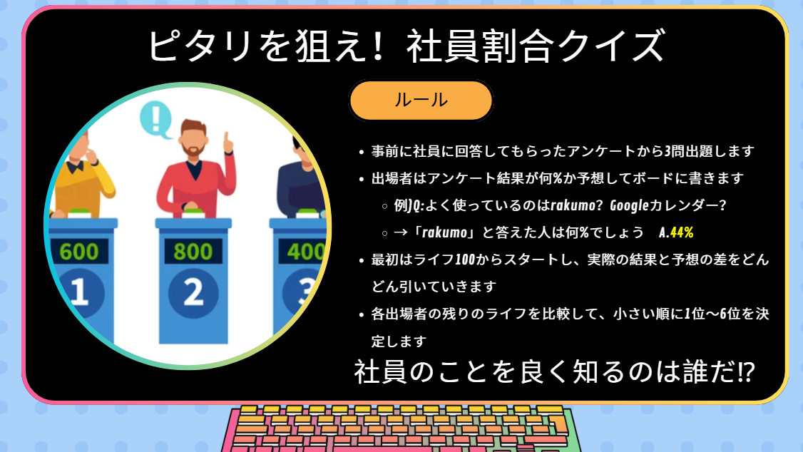 クイズの内容は、社内のSlack(チャットツール)のアイコンについてやリモートワーク中の服装(上下着替えるかどうか)など。