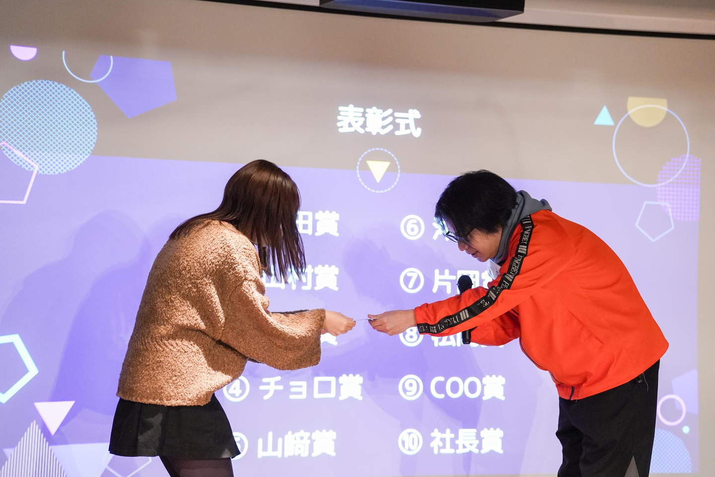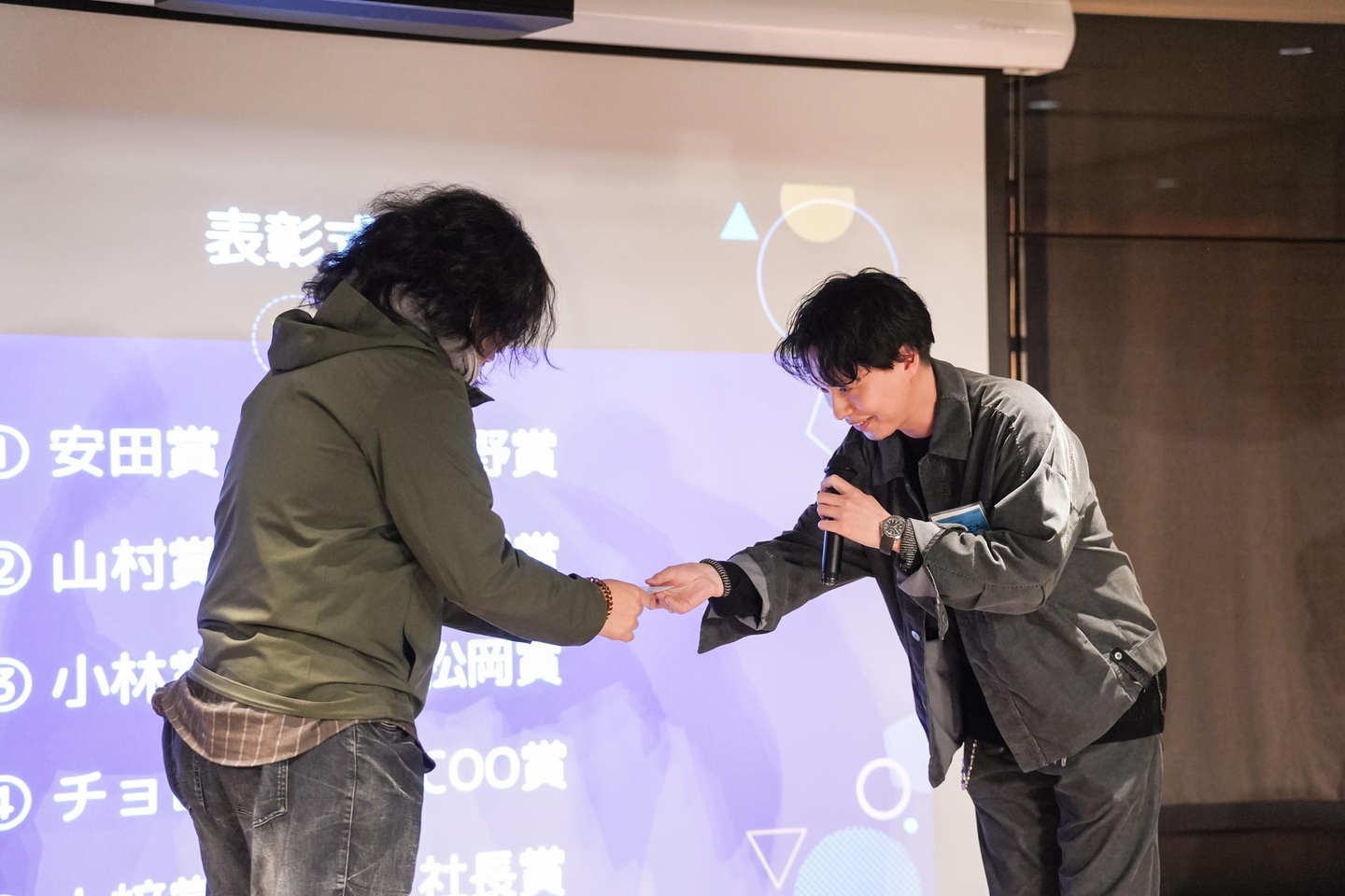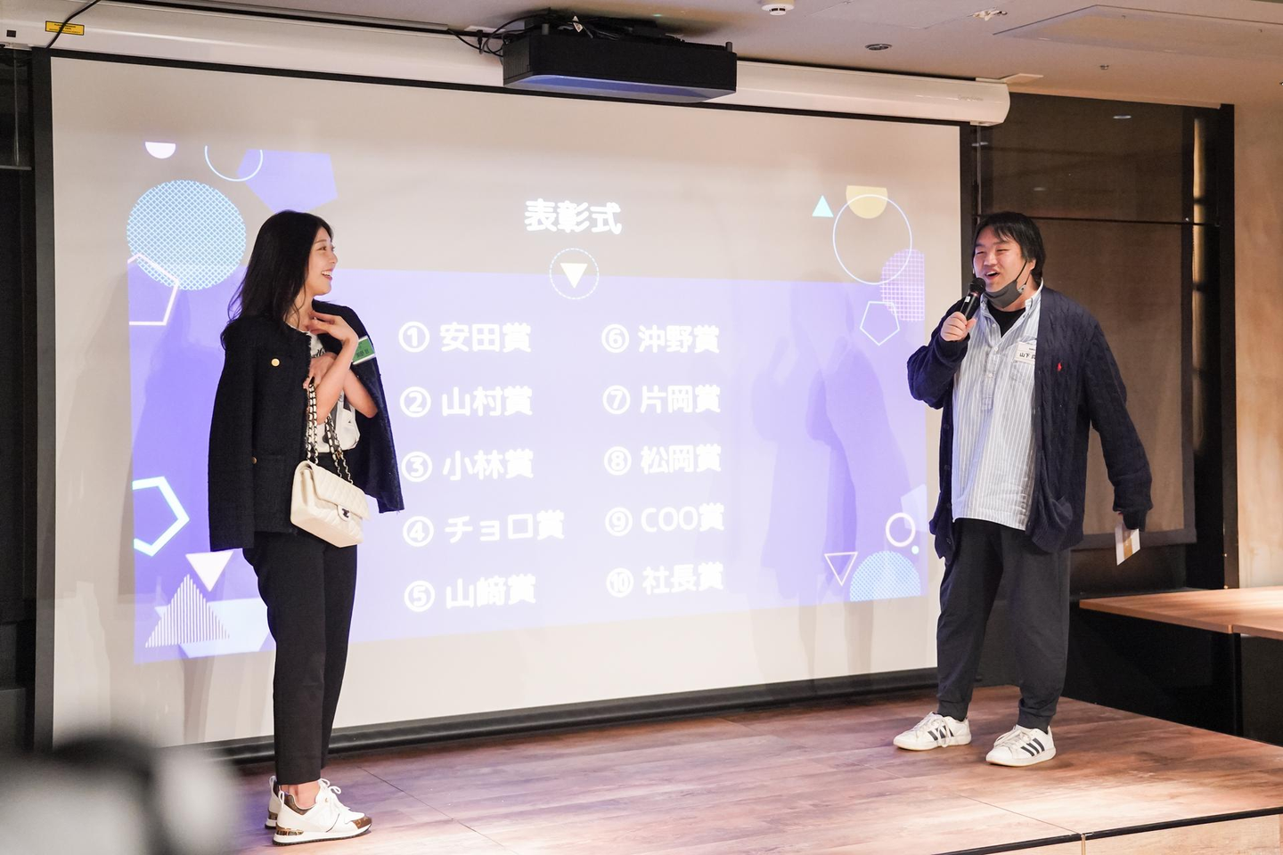 表彰式からは全体の司会担当、22新卒の営業と23新卒のディレクターが進行します。