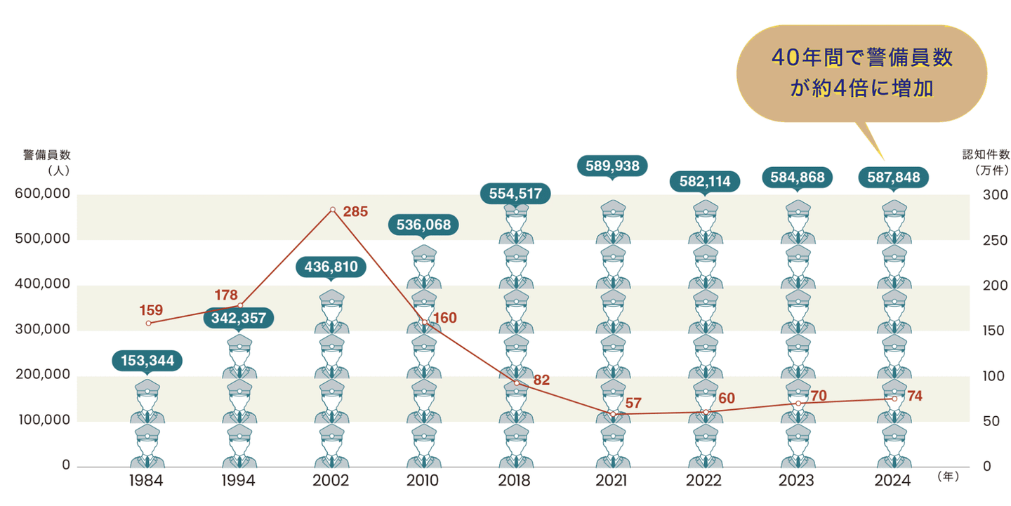 実際に警備員数が増えるのに比例して、刑法犯の認知件数は減少しています。数字が示す通り、