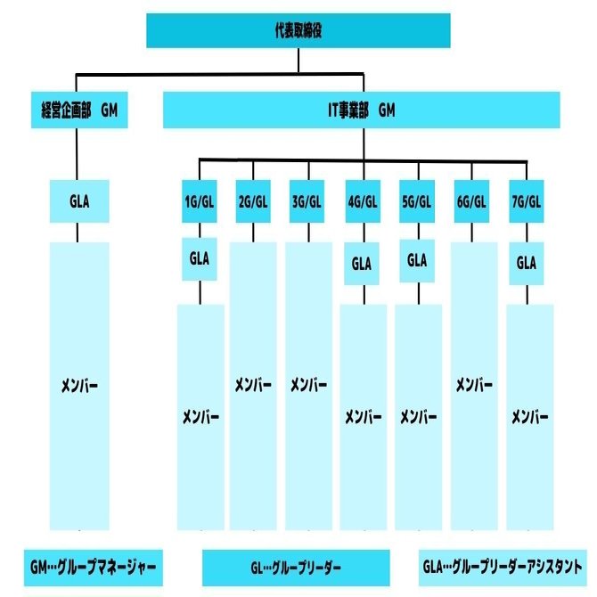 VITAは部署のトップにGM(グループマネージャー)がいて、その下にGL(グループリーダー)がいて、そのアシスタントにGLA(グループリーダーアシスタント)がつき、メンバーをサポートするような構成になっています。