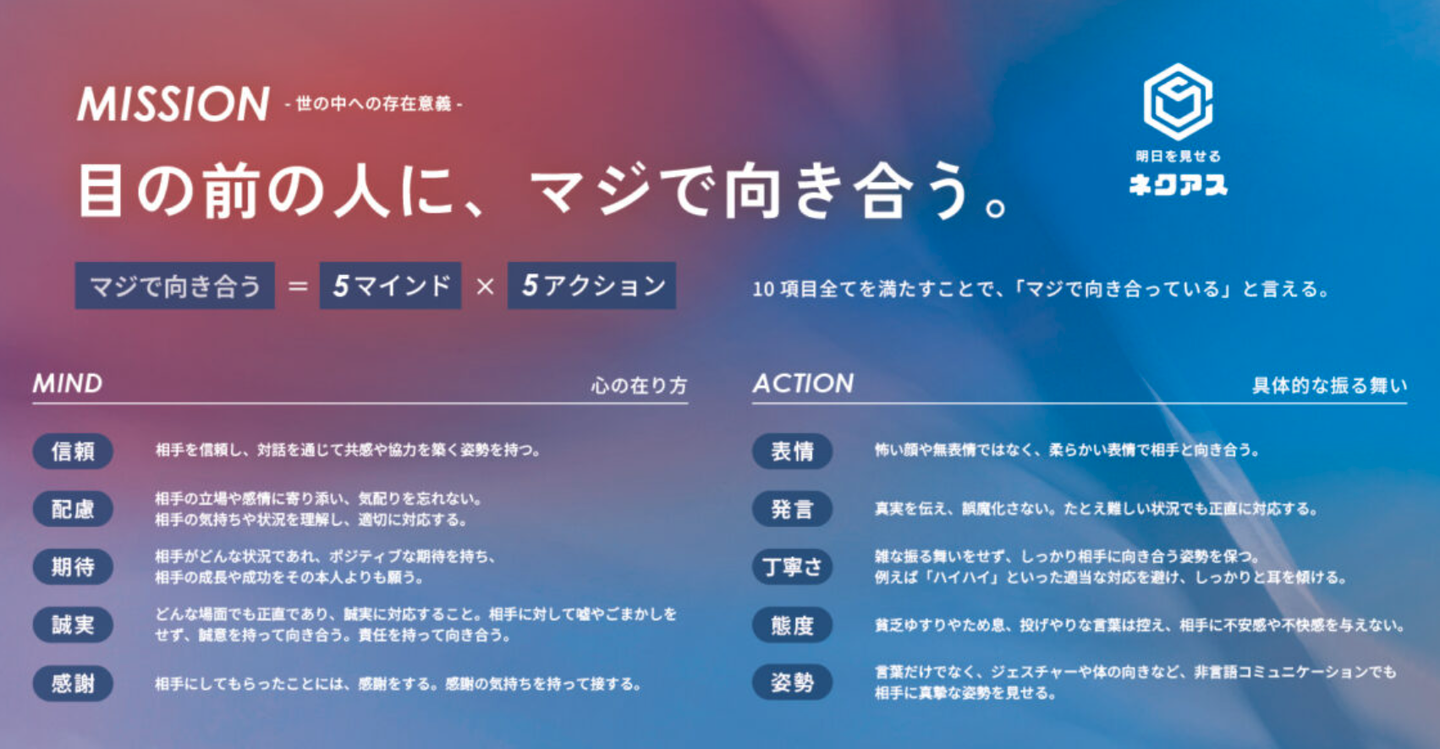 ネクアスは、5つのマインドと5つのアクションを定義し、マジで向き合えているかを判断しています。先程の接客の中で言うのであれば、配慮、信頼が直結してきますし、アクションの中で言うのであれば、表情、発言、姿勢なんかが大事だったと思います。