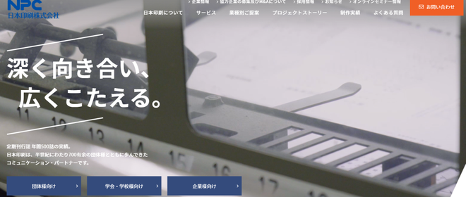 日本印刷は、印刷会社であって印刷会社にあらず。 「モノ」の提供で終わることなく、「価値」を提供してきた当社。 「お客様との直取引100%」、「顧客の7割が団体様」、「営業50人体制」という業界でも稀有な存在です。 強いパートナーシップを最大の武器としており、定期刊行書籍などの長期継続のお取引が多く、デジタル分野までサービスの幅が非常に広いことが特徴です。 今の時代だからこそ、人と向き合い、人にしかできないサービスを。 私たちと一緒に、真に必要とされるプロを目指しませんか?