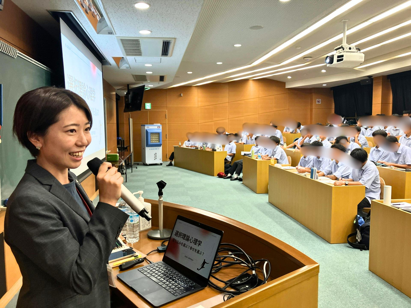 思考や感情は自分で選べることを心理学の視点で紹介。「自分にしか伝えられないことがまだまだある」と語り、可能性の原石である学生たちに貢献したいという思いを伝えました。