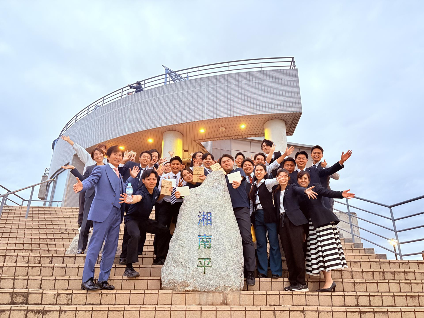 山頂の展望台には、全社員がサプライズで待ち構えており、内定者たちは歓声と笑顔で迎えられました🎉