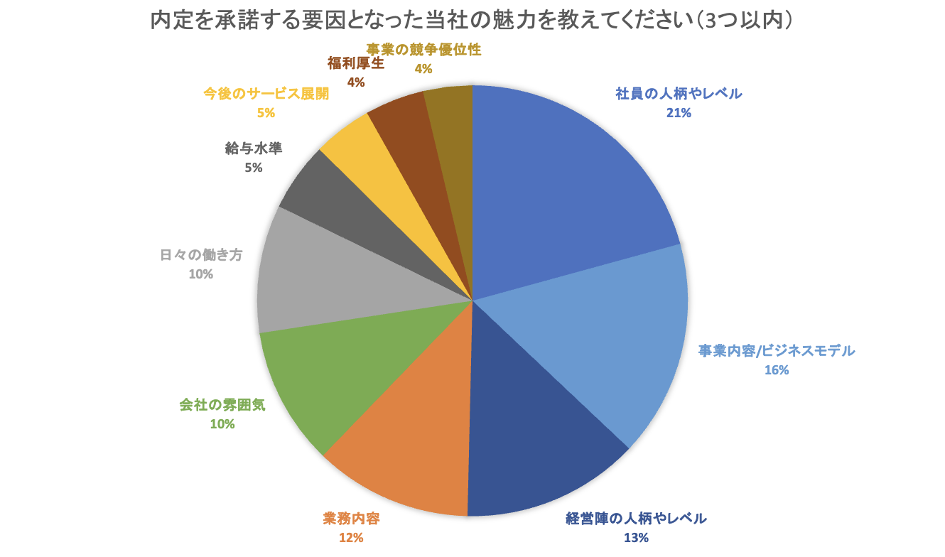 入社の決め手として最も多かったのは「社員の人柄やレベル」(21%)、次いで「事業内容/ビジネスモデル」(16%)でした。