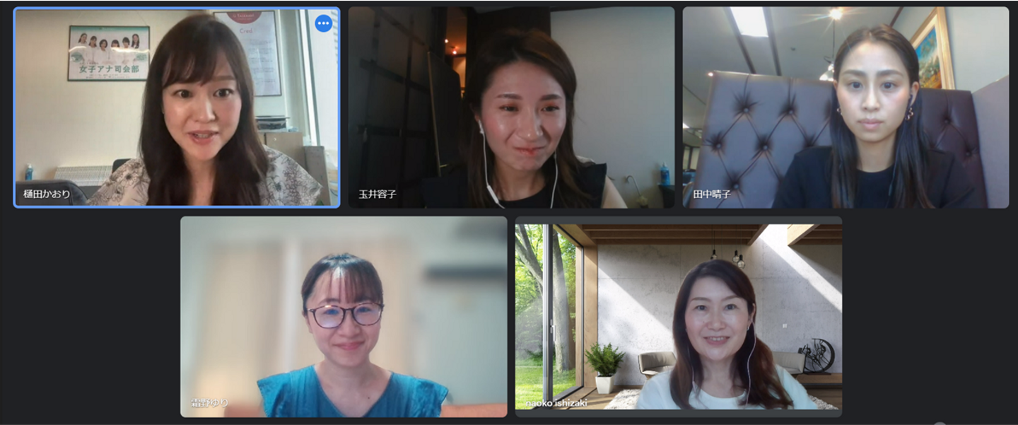 参加者は、その日出勤している「女子アナ広報室」メンバー。常勤のオフィス出社メンバーもいれば、在宅勤務メンバーもいます。在宅メンバーは稼働日や時間が1人ひとり違うため、毎日顔ぶれは少しずつ変わります。タイミングが合えば、代表、インターン生、営業に関わるメンバーらも参加します。