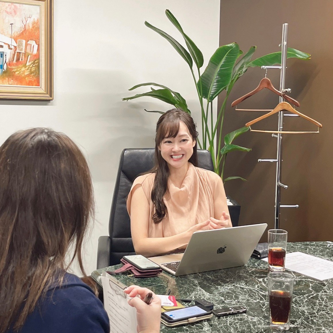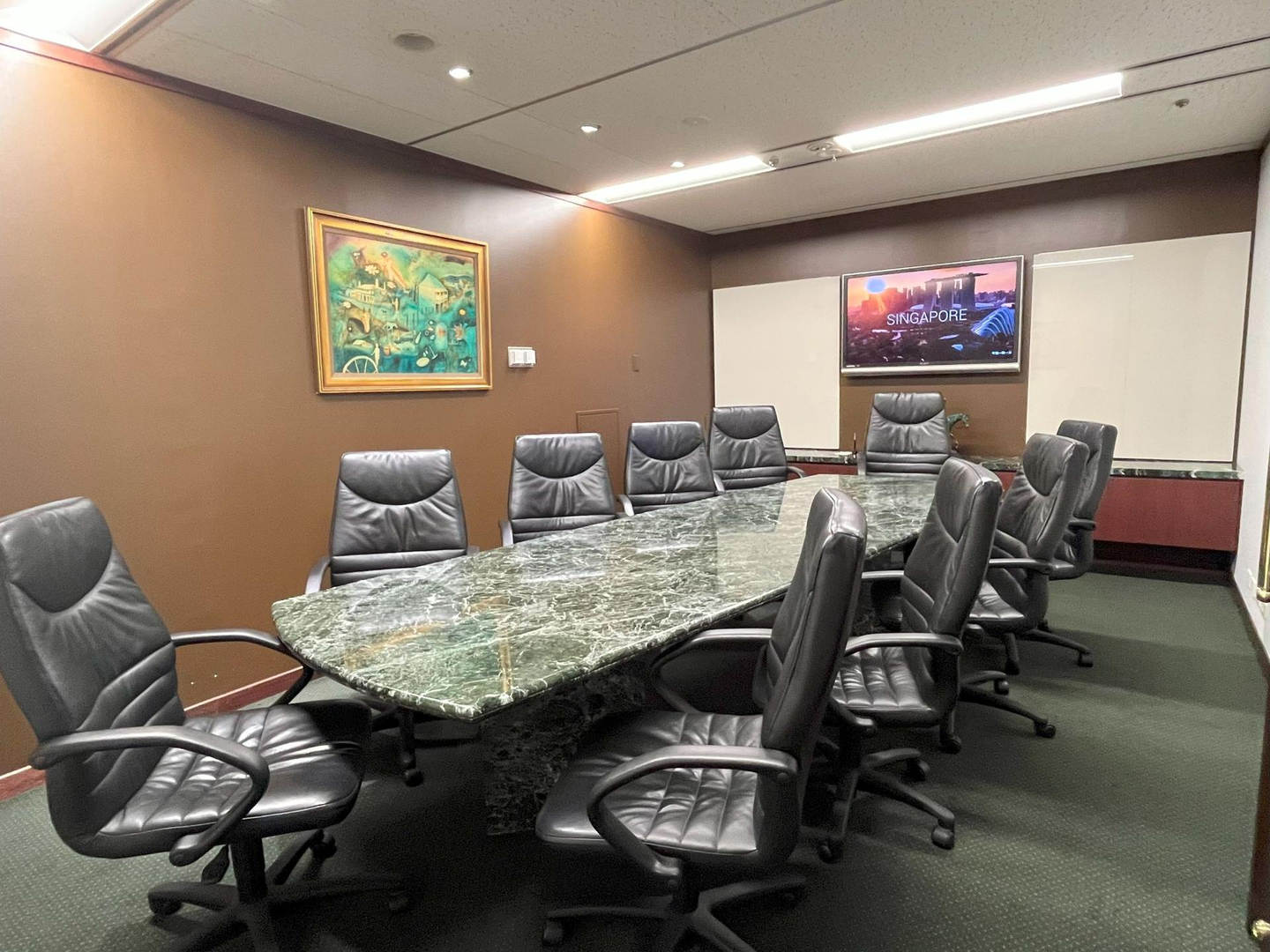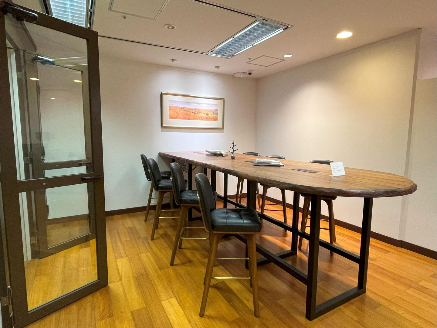 メディア取材が入ったときや個室での来客対応をするときは、会議室を借りています。大理石の大きな会議テーブルと黒のひじ掛け付きチェアが10名分並び、役員室のような重厚な雰囲気です。
