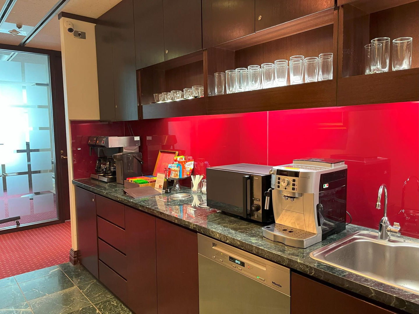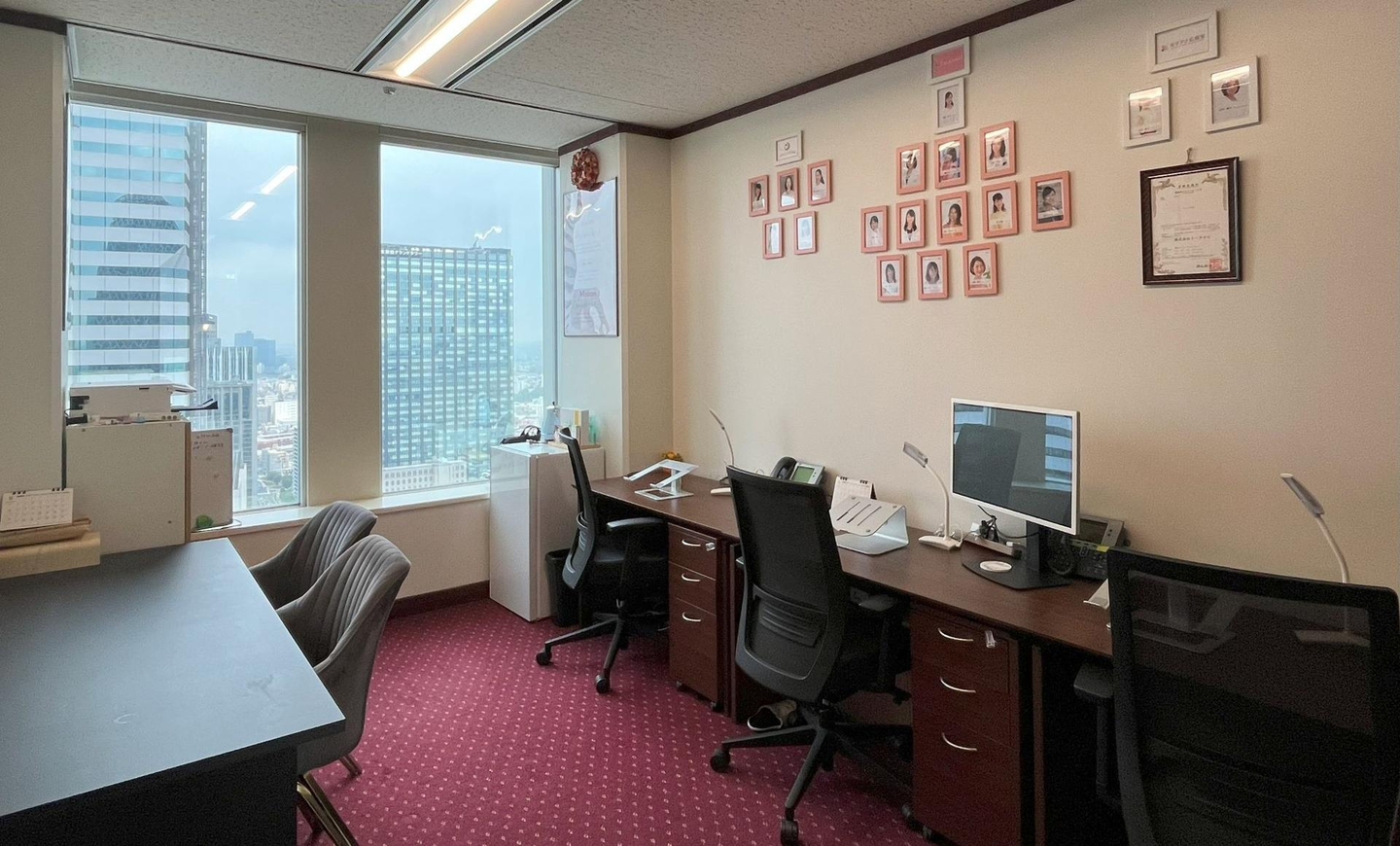 共有スペースの先の廊下を行くと、各社の個室が並んでいます。廊下の赤いカーペットも、写真映えするスポットです。