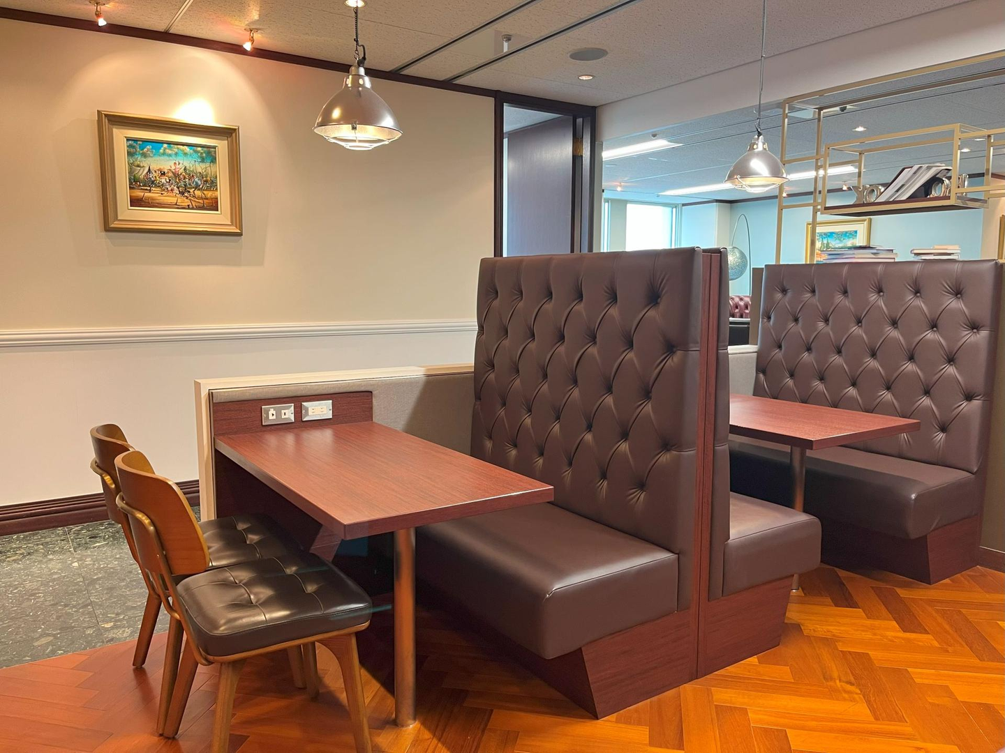 来客の待ち合わせスペースとして使われています。シックな趣きのある赤茶色のソファに丸いガラステーブル、壁の絵画。窓からの眺めもよく、まるでホテルの一角のようです。