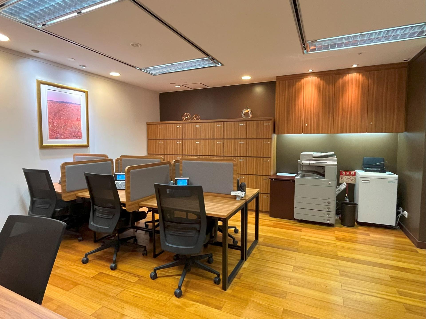 こちらは、ついたて付きのデスクスペース。機能的なオフィスのイメージです。デスクには固定電話があり、奥のコピー機を利用することもできます。
