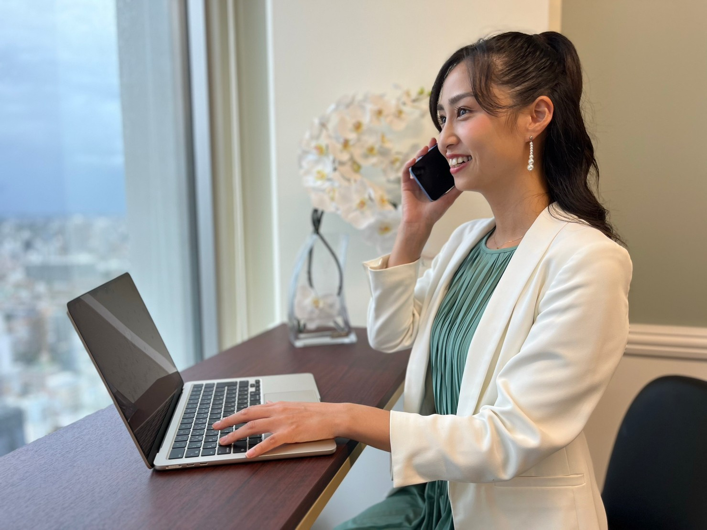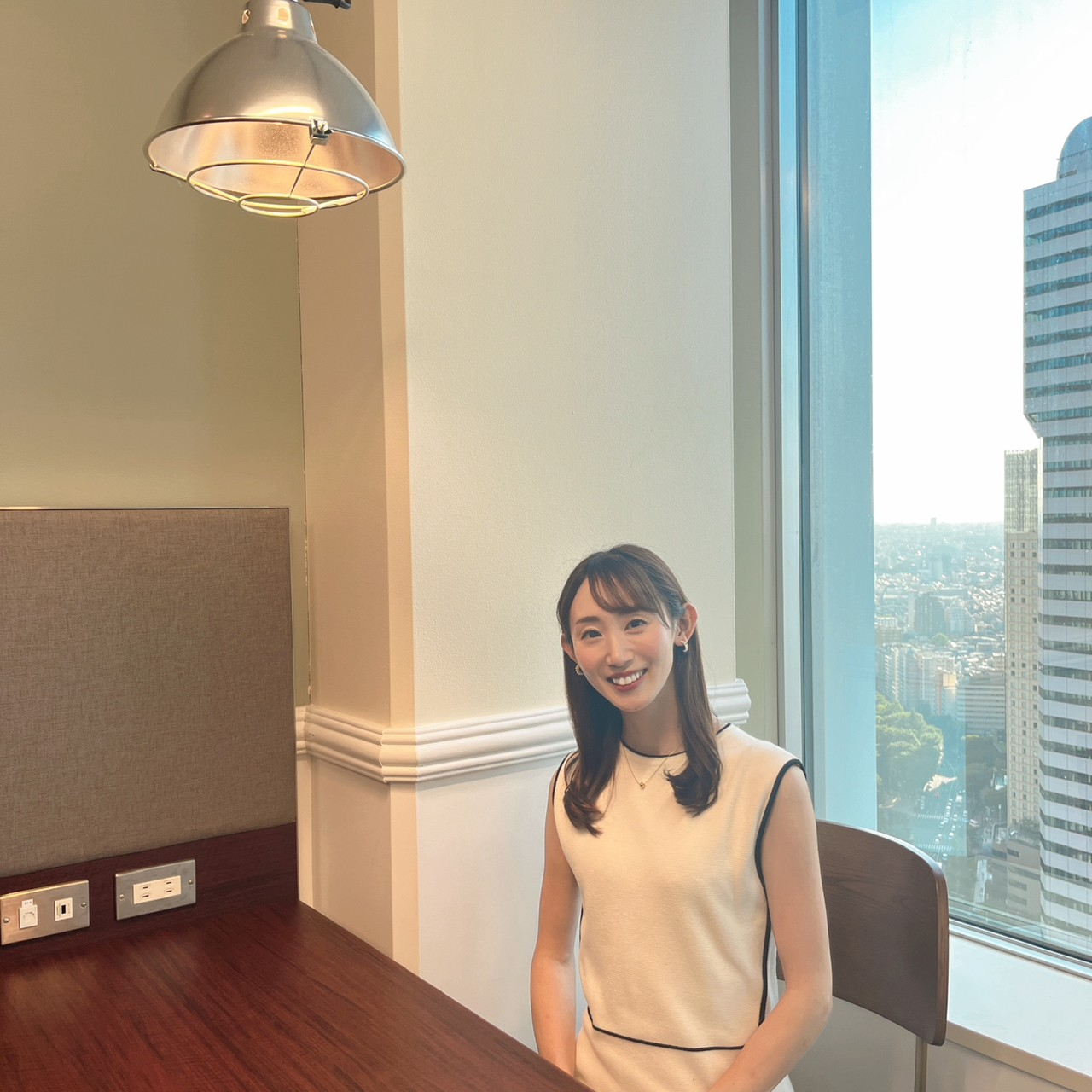 フロントブースの奥にある窓辺の席です。高層階からの眺めが気持ちよく、天気のいい日には富士山も見えます!