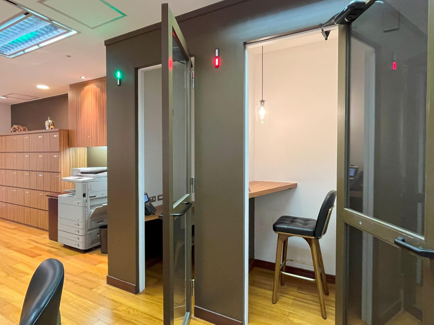 おこもり感のある1人用の小さな個室には、ペンダントライトとブラックのかわいらしいチェアが設置されています。背後の壁はレッド×ブラウン色のシックなデザインで、PCの背景を設定しなくてもおしゃれな雰囲気になります!