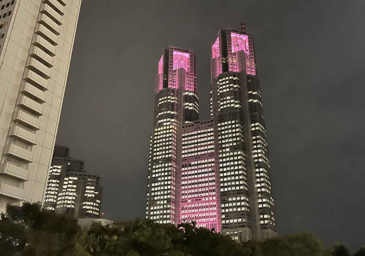 外に出ると、都庁のライトアップが目に飛び込んできます。この日は都庁がピンク色に!乳がんの啓発キャンペーン「ピンクリボン」に合わせ、ライトアップされていたようです。