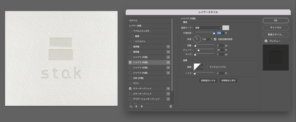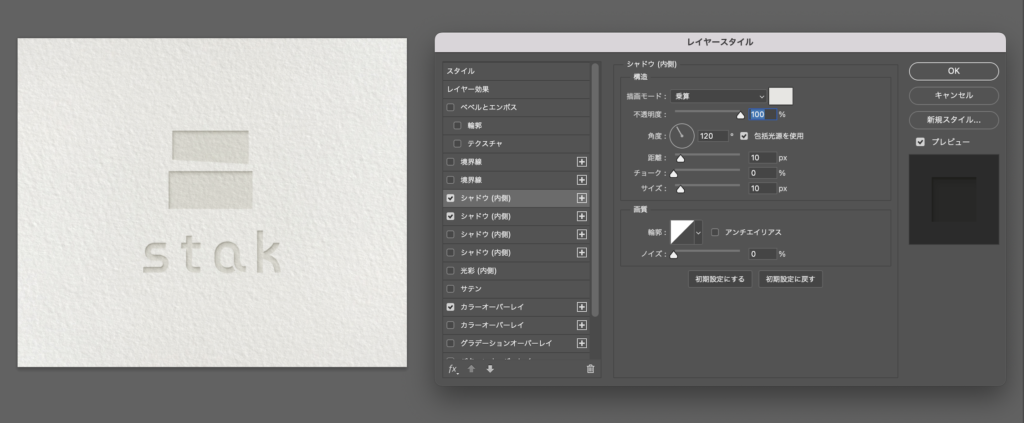 1)「シャドウ(内側)」の横にある「+」をクリックして、以下のように設定します。
