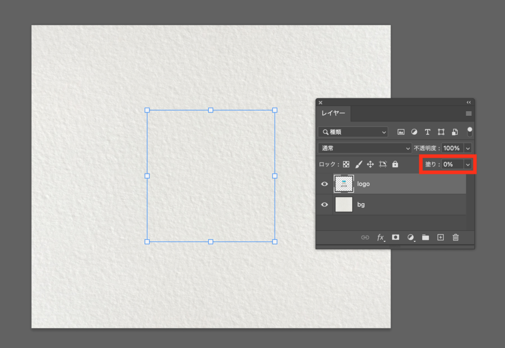 3)ロゴマークのレイヤーをダブルクリックして、レイヤー名を「logo」と⼊⼒し「塗り:0%」に設定します。
