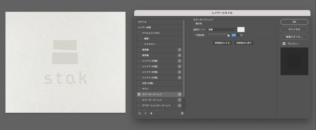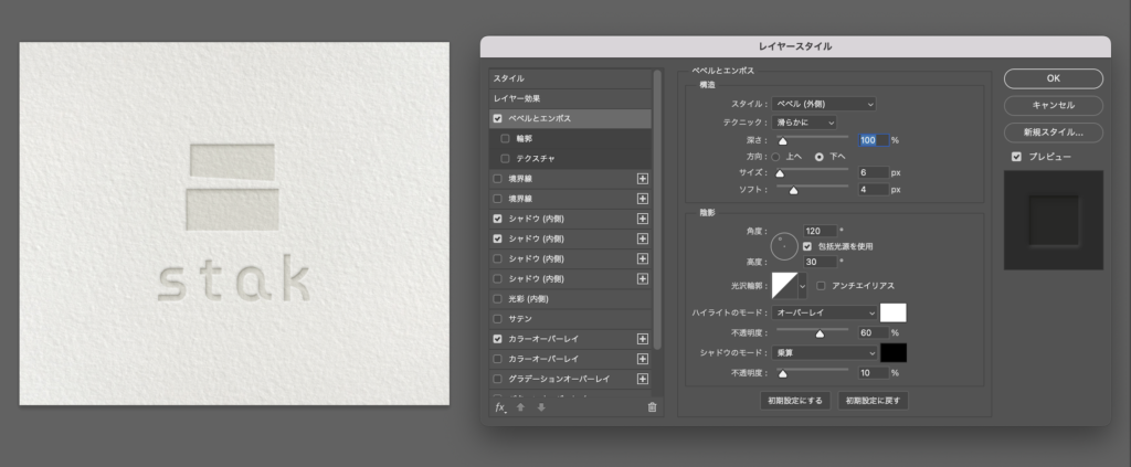 複数のレイヤースタイルの組み合わせで、刻印(デボス)加⼯を表現できました!