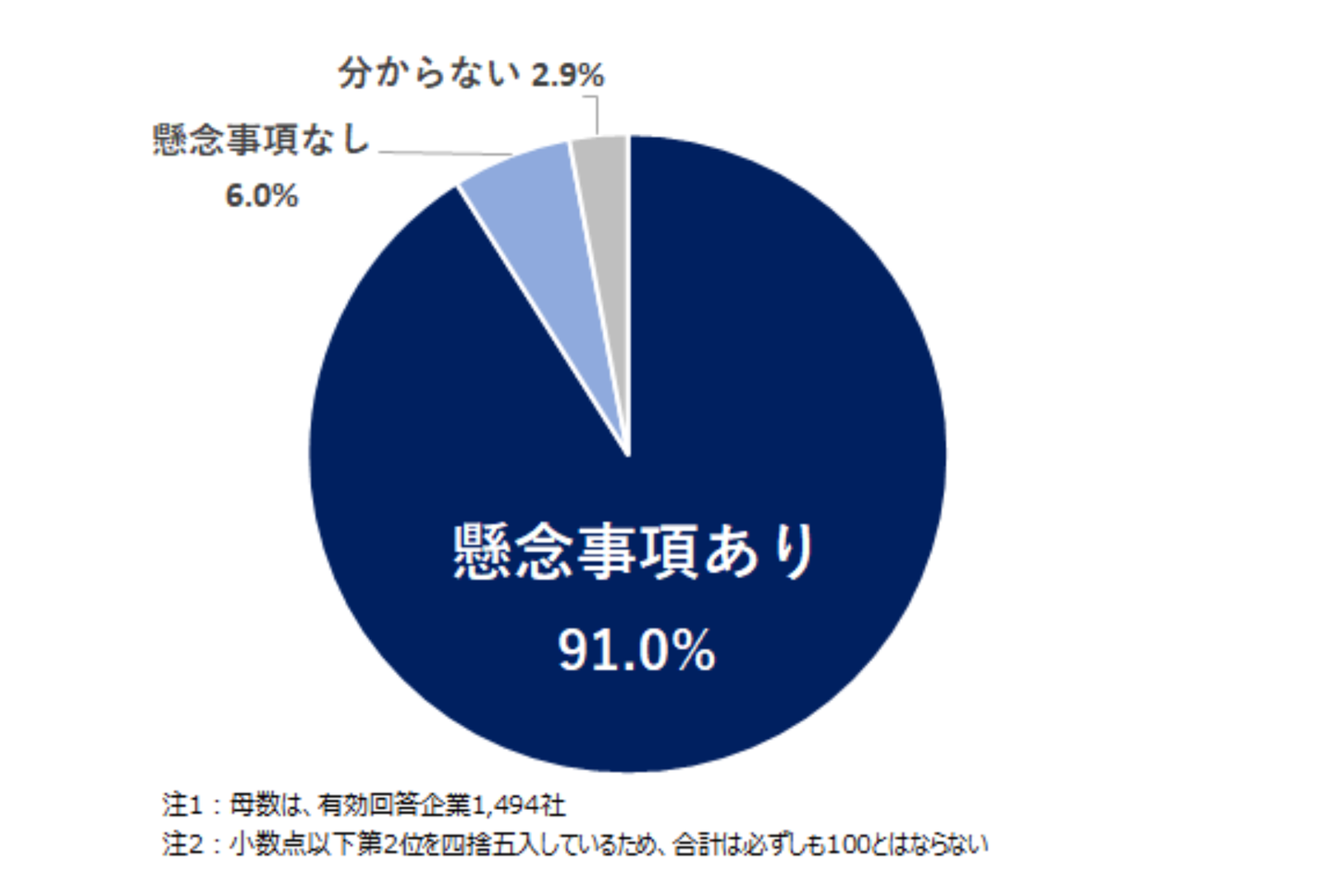 インボイス制度導入にともなう懸念事項の有無91.0%の企業が制度導入に関して、「懸念事項を持っている」と回答しております。