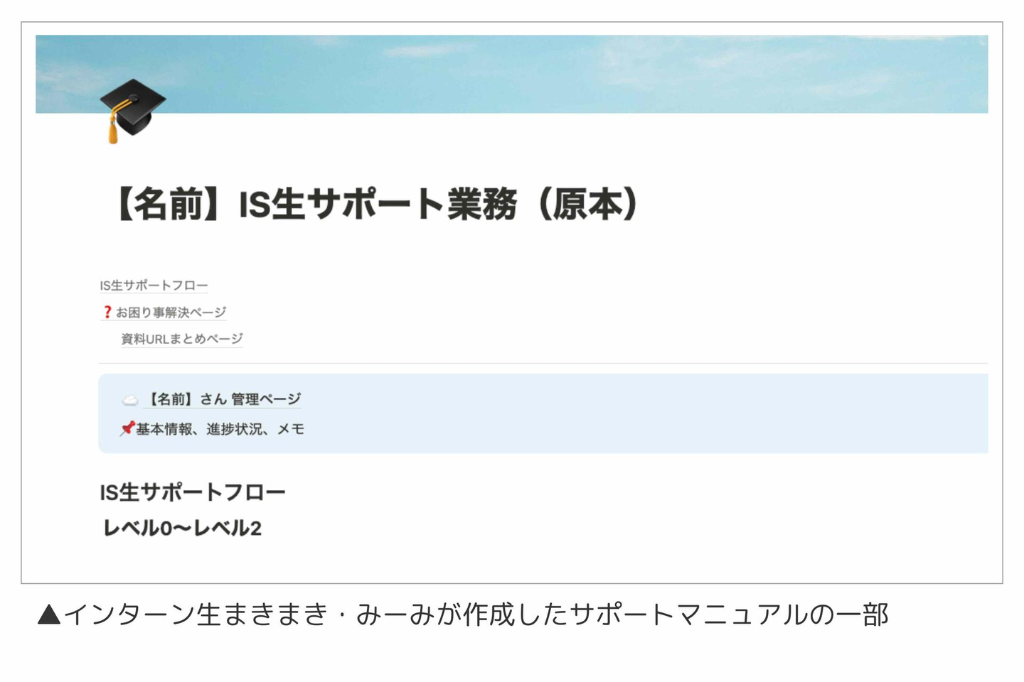 とはいえ、インターン生が教育フローを考えるのも限度があるため社員との調整も行いました。内容は決めすぎず最低限の型を作り、今後も柔軟に更新していけるようマニュアルはNotionに落とし込んだのもこだわりの1つです。