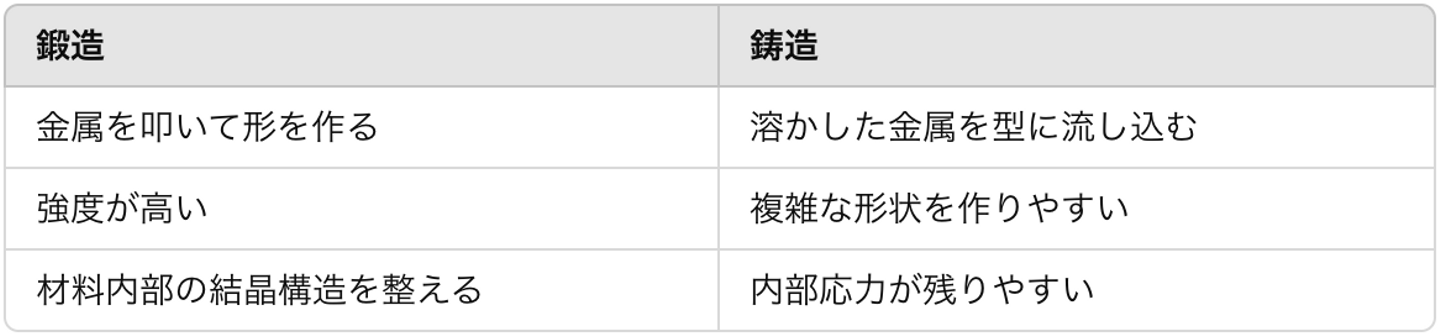 鍛造は強度が必要な製品に、鋳造は複雑な形状の製品に適していることが特徴です。