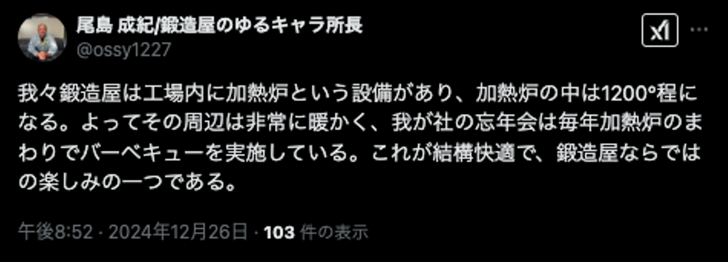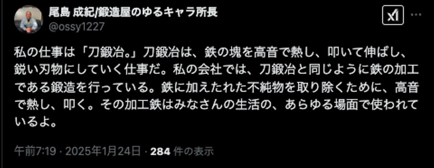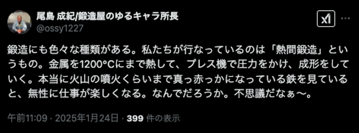 今回のX運用の目的は、鍛造の魅力をお伝えすることでもありますので、上記のようにみなさんがわかりやすい表現で鍛造を紹介しています。