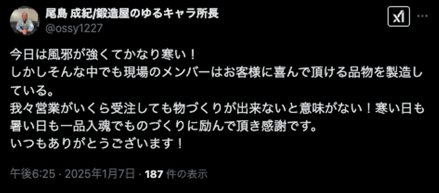 これまでXに触れたことがなく、わからないことだらけからのスタートでしたが、今では投稿にも徐々に慣れ、山下鍛造所や鍛造の魅力を広めるべく頑張っています。