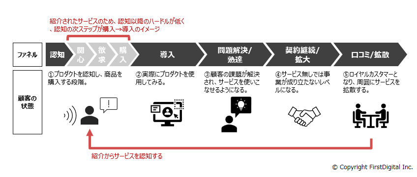 前置きが長くなってしまいましたが、この一連の顧客対応を行い、既存顧客がファン化し周囲に拡散し、そこから新規顧客を獲得できる状態になってはじめて、カスタマーサクセスが実現したと言えるのです。一口に既存顧客対応だといって、サポート部門を立ち上げたり、オンボーディング支援をしたり、クロスセルばかりを狙った施策を行うのではなく、しっかり既存顧客のニーズを拾い、顧客の不満を解消し期待に応えるようサービスをブラッシュアップし、サービス使いこなしていただくよう、顧客に寄り添った対応が必要なのです。
