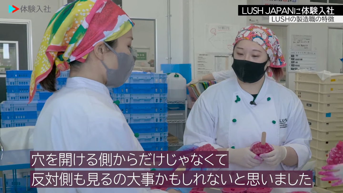 体験入社モデルの長谷川さんが最初に出会ったのは、本物のレモンやフレッシュな原材料をふんだんに使う製造の裏側でした。 「ローズジャムバブルルーン」という入浴剤を手作業で作るシーンでは、ただ丸めるだけでなく、空気を抜きながら美しく仕上げる職人技のような工程を体験。 機械化された工場というより、まさに大きな「台所(キッチン)」でお料理をしているような感覚に、長谷川さんも驚きを隠せない様子でした。