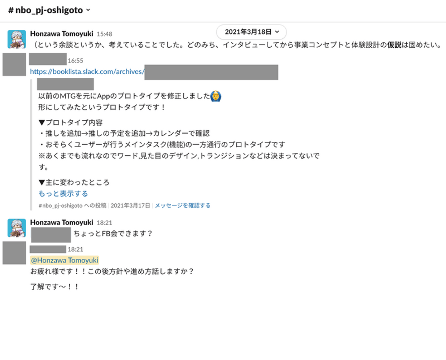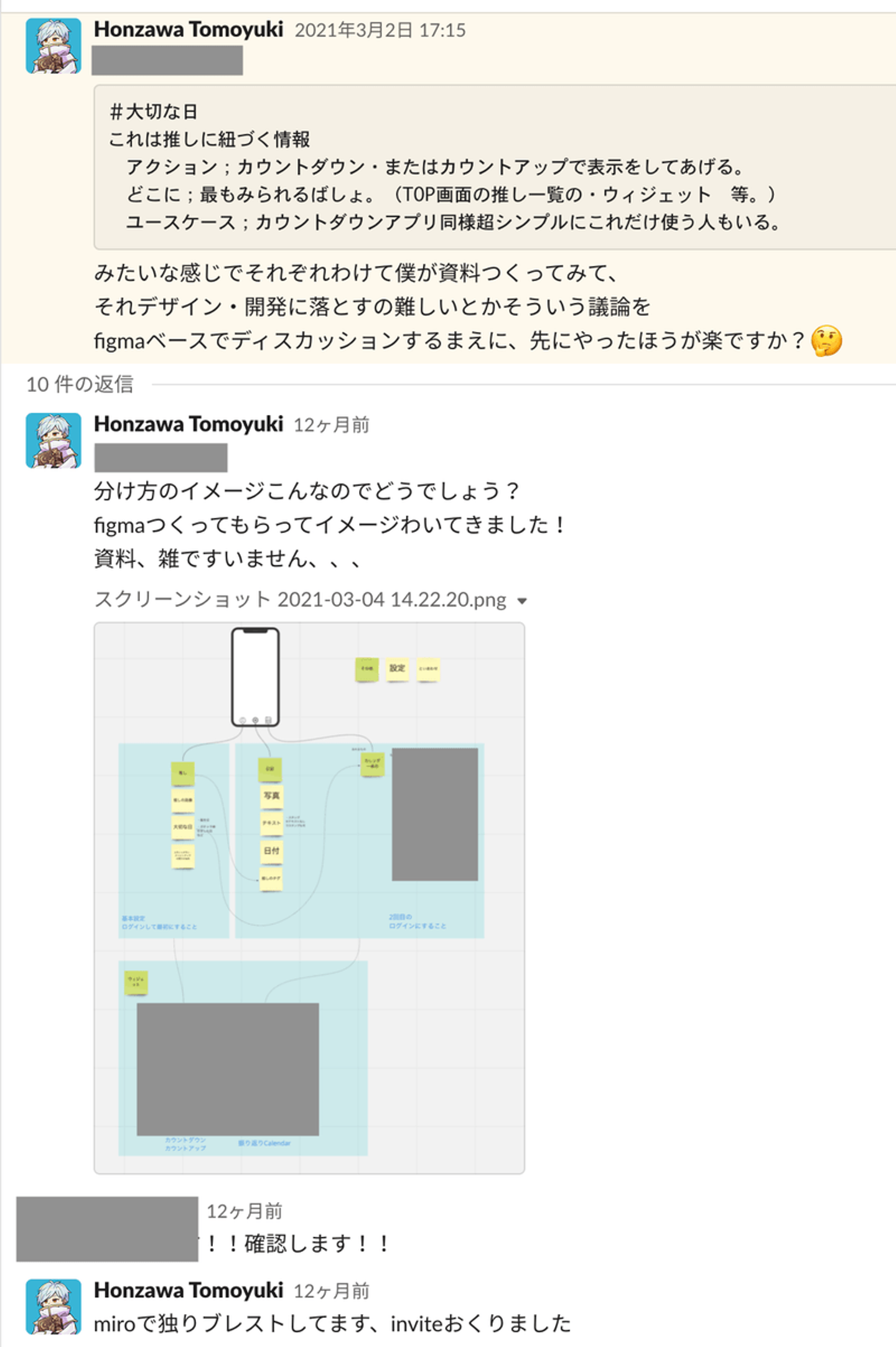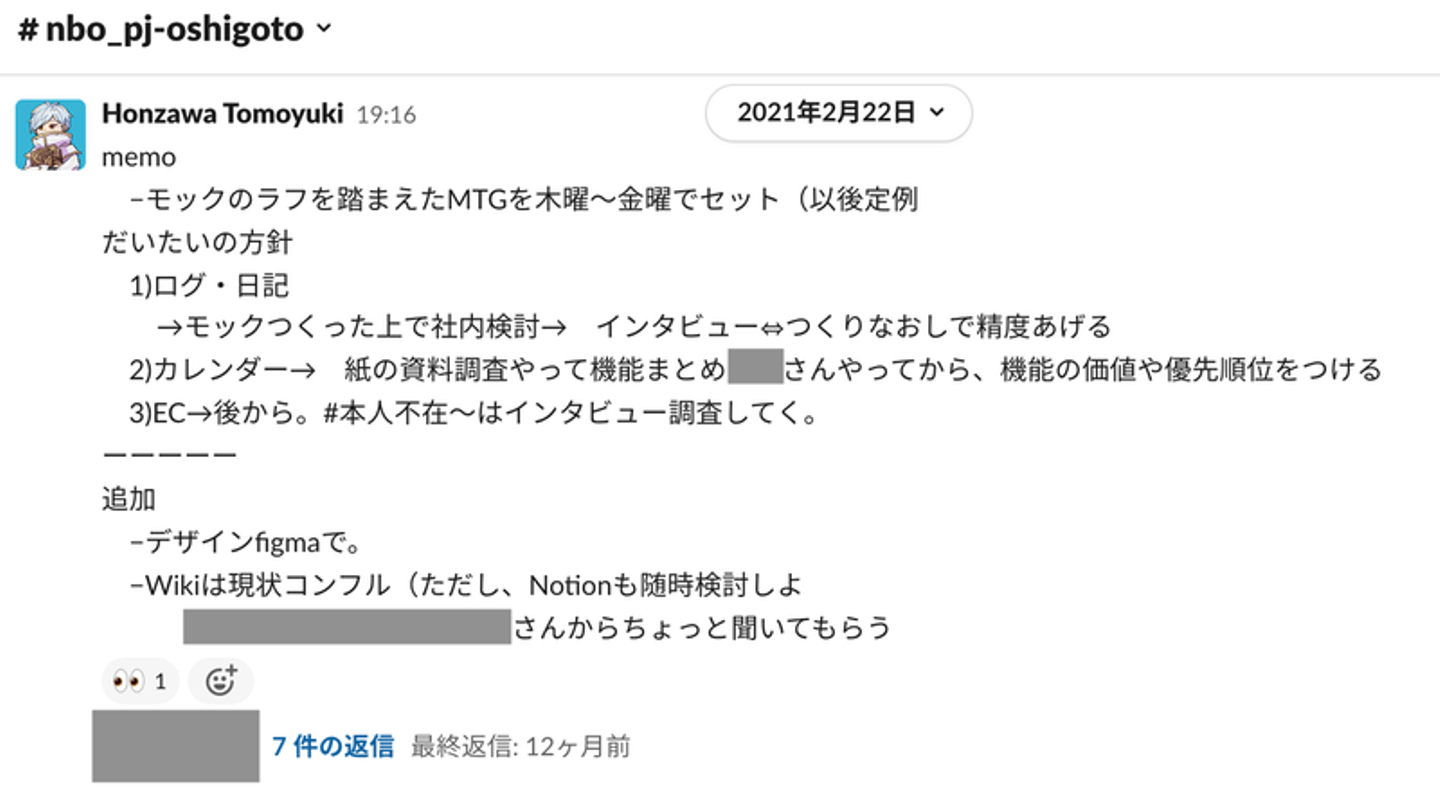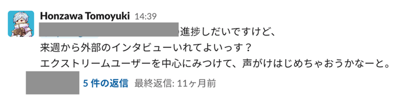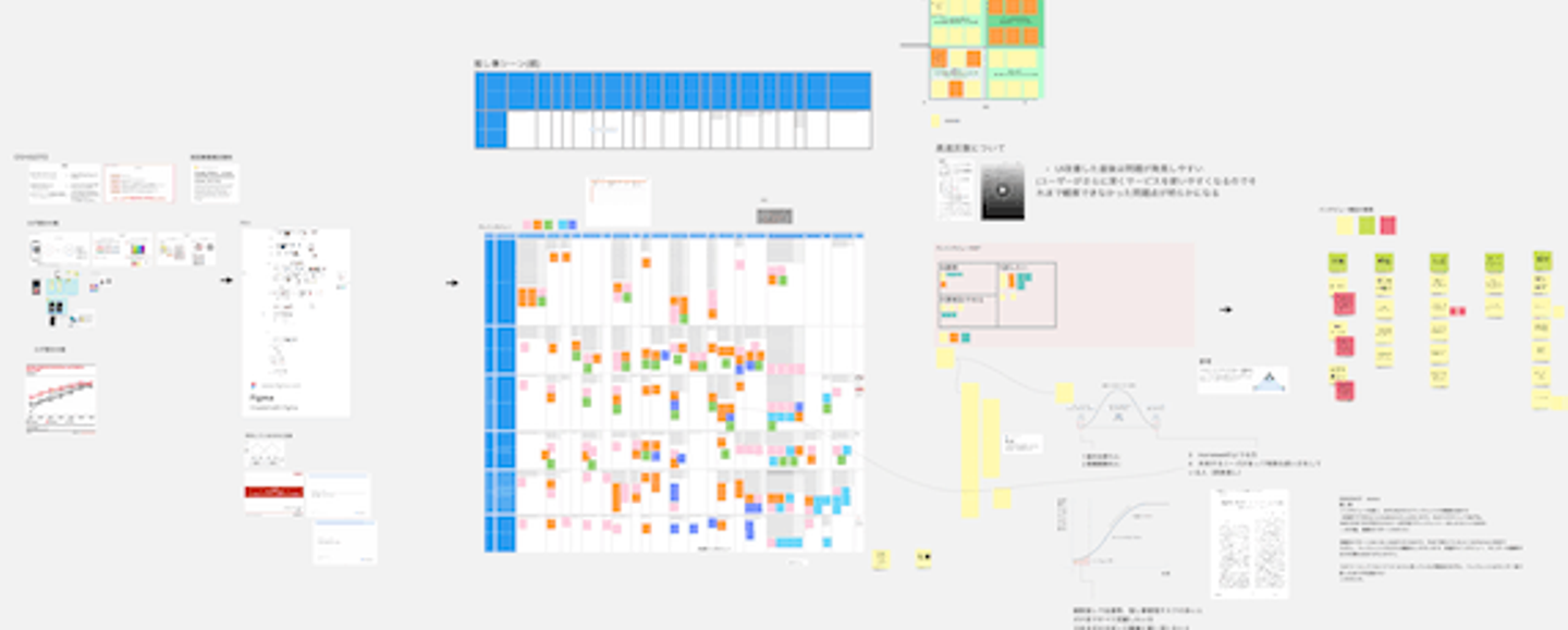 チーム内(当時自分とUIデザイナー・エンジニアの3名)でスラック上で検討用のチャンネルをつくり、Figmaでつくったデザインをたたき台にインタビューを行い、Miroで整理してを繰り返していました。
