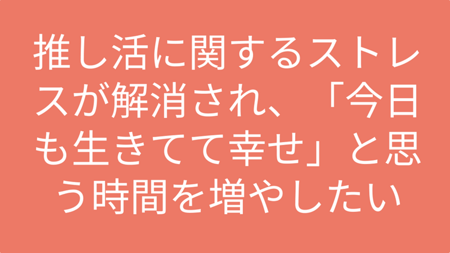 推しがいたり、推し活を生きる活力にする人が増えてきて「推し活」という言葉が一般用語として浸透してきました。一方で、推し活の沼にのめり込む程にストレスを感じたり、不便なことにぶつかっている人が多いということに事業リサーチ(インタビュー)を通して感じることがありました。インタビュー中に泣き出す方もいました。できる限り苦痛(ペイン)を軽減し、不便なことを解消し、推しとの時間を楽しめるようにしたいなと思ったのがサービスに取り組むきっかけでした。