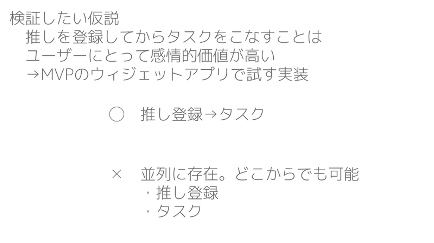 ただ、推しを登録してからタスクをこなすことに価値がなければ、ウィジェット作成アプリやカレンダーアプリはすでに世の中に無数にあるので、新規でサービス提供する意味もないなと思っていました😊そのため、価値仮説に基づいてつくるMVPは下記のスコープとしました。