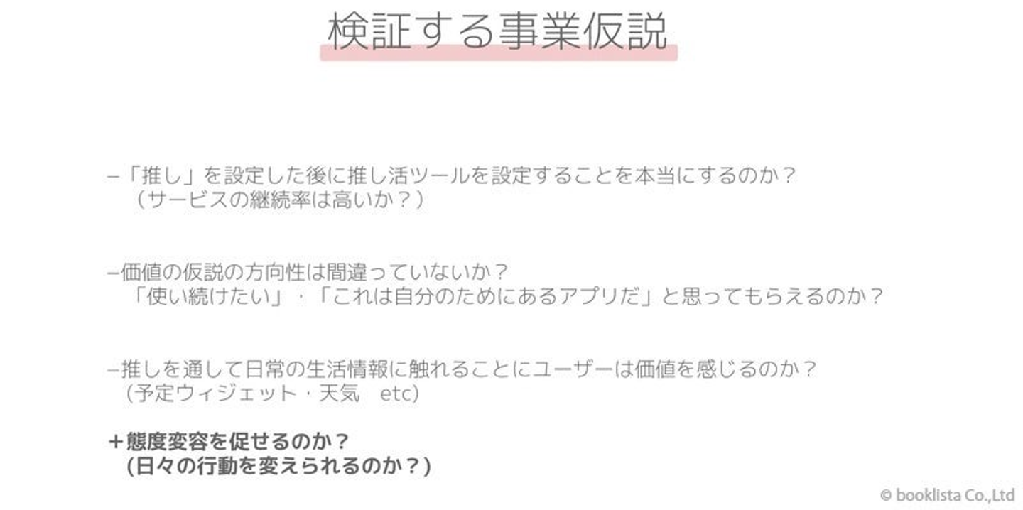 また、ニーズがあるからといって、事業計画作成や実装をすぐには行いませんでした。定性的な検証を踏まえた上で、仮説を数字で検証するためにMVPをつくろうと思っていたからです。