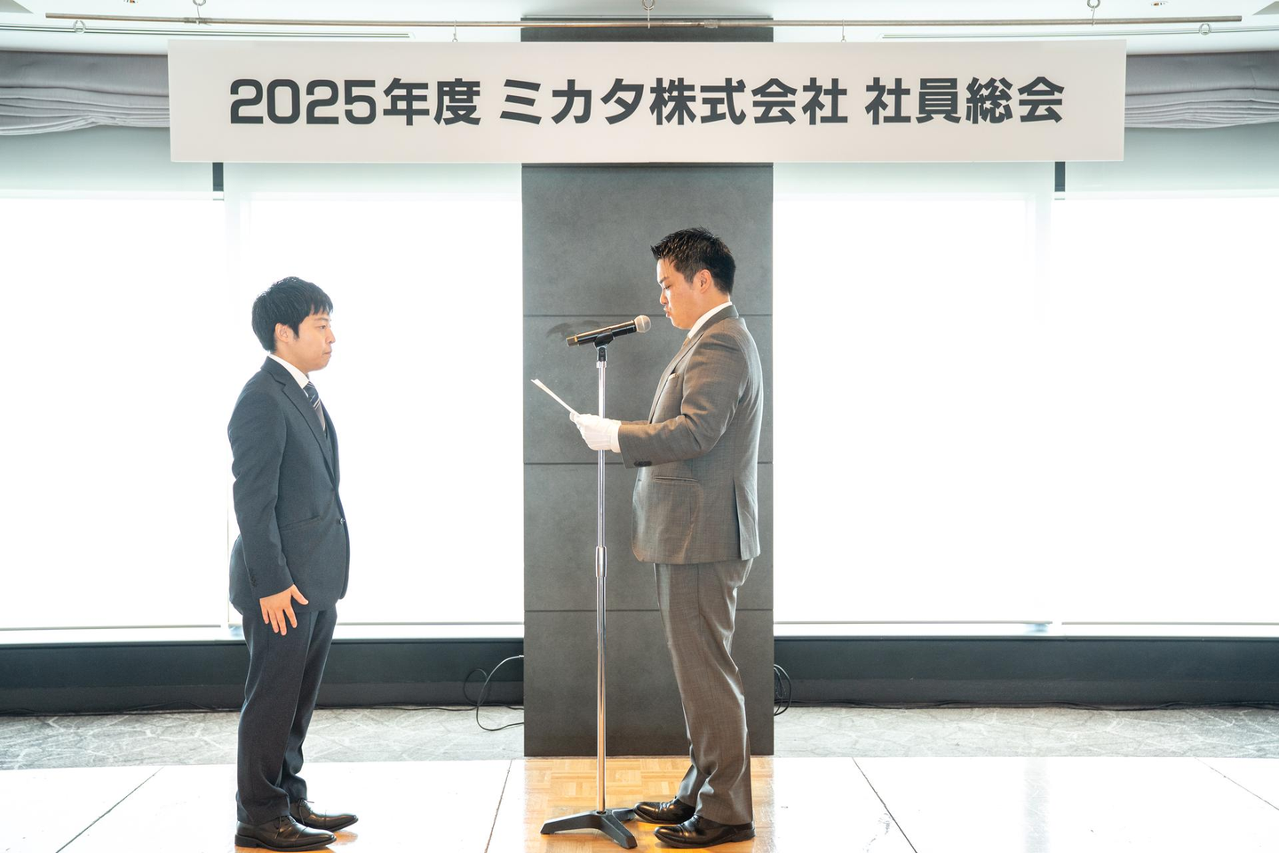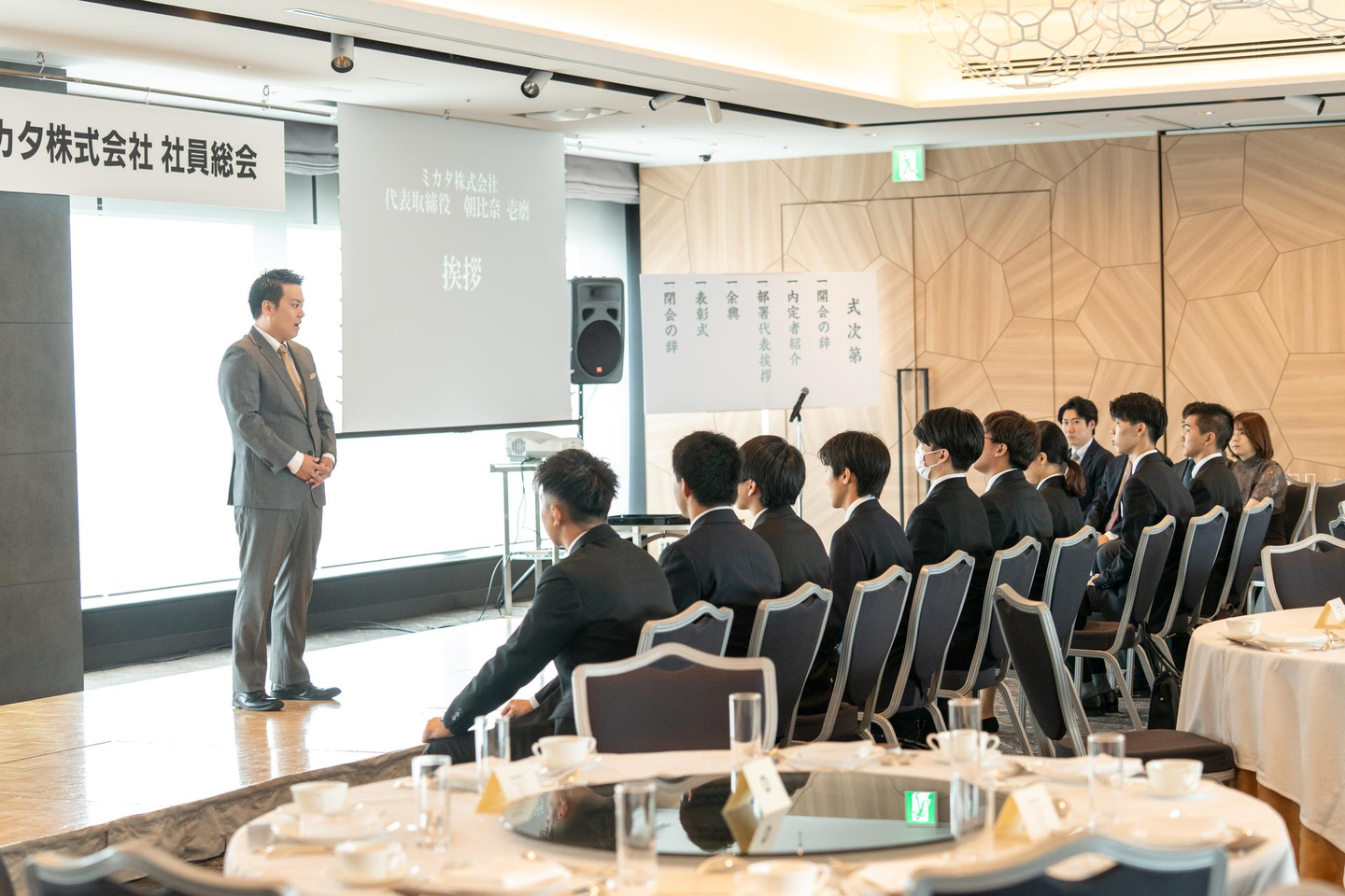 毎年社員総会には内定者の方々にも参加していただき、ミカタ全社員と触れ合うことで、より会社の社風を感じ、会社の今後の展望を聞き、会社のこれからの方向性の確認をしていただく場となっています。