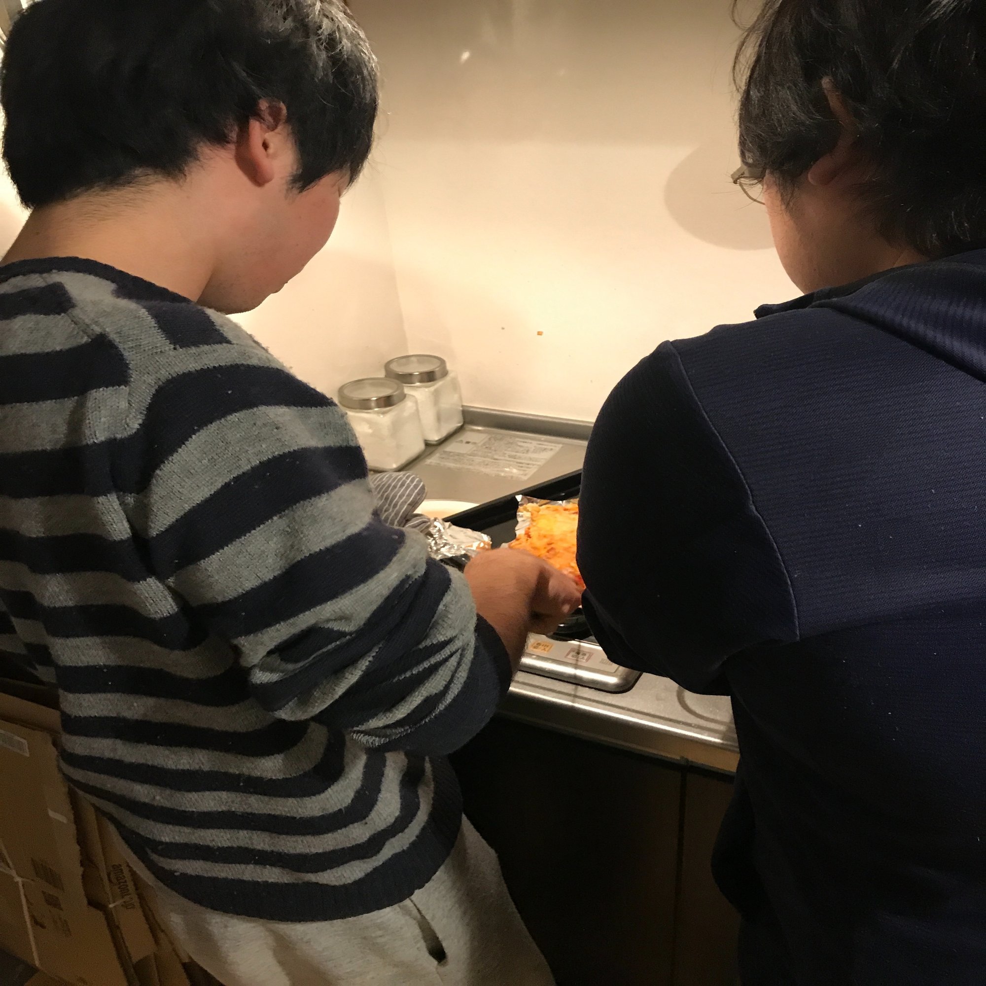 👆 共同創業者の家兼オフィスで自炊する様子、笑