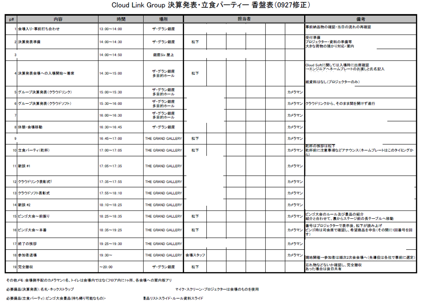 色々ぼかしてますが、最終の香盤表です。2日前まで調整してたんだな…