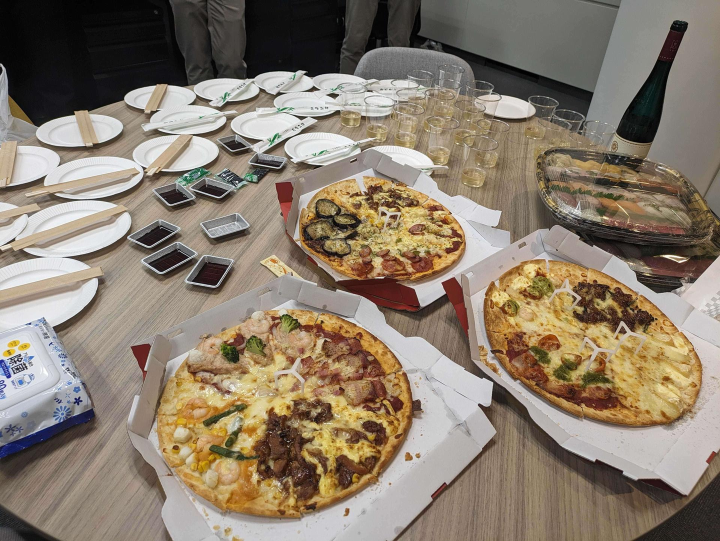 写真のピッツァとSUSHIだけでは全然量が足りなかったので、唐揚げとポテトを追加しました。